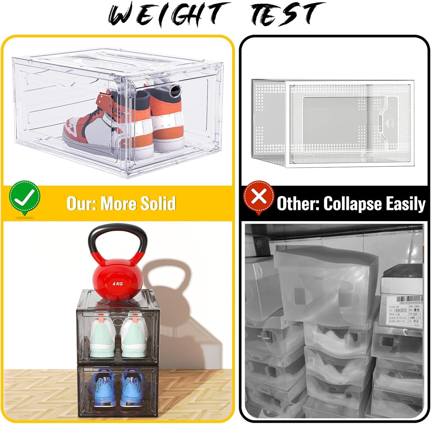 • Multipurpose storage: These clear shoe boxes stackable is designed for making it easier to find anything in need. Good for organizing with shoes, clothes, socks, hat, underwear, bra, scarves and accessories. Finally, stack the boxes neatly to save a lot of space.