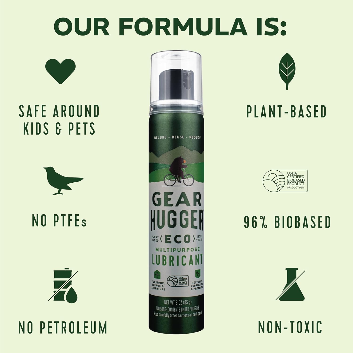 • ENVIRONMENTALLY FRIENDLY LUBRICANT THAT PROTECTS AND RESTORES WITHOUT HARMING OUR PLANET – A convenient 3-pack means you can always take it with you anywhere you need it! Make an eco-friendly choice with Gear Hugger to restore, lubricate and protect your gear so it functions optimally, lasts longer and stays out of the landfill. Gear Hugger means sustainability! Replace harsh odors, harmful petroleum and PTFE chemicals with our plant-based, non-toxic formula that’s USDA Certified 96% bio-based.