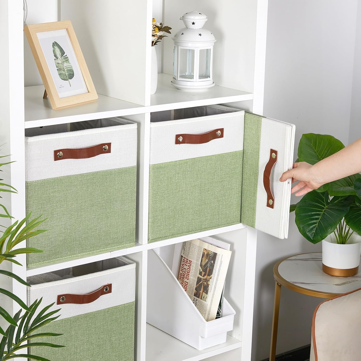 • 【Premium Material】The fabric used in the 12x12 storage cube bins is fashionable and breathable, sturdy, breathable fabric materials with no peculiar smell, and the cardboard inside is strong and easy to fold. These green storage cubes for organizing are sturdy enough to hold your stuff well. The leather handle is durable and easy to carry