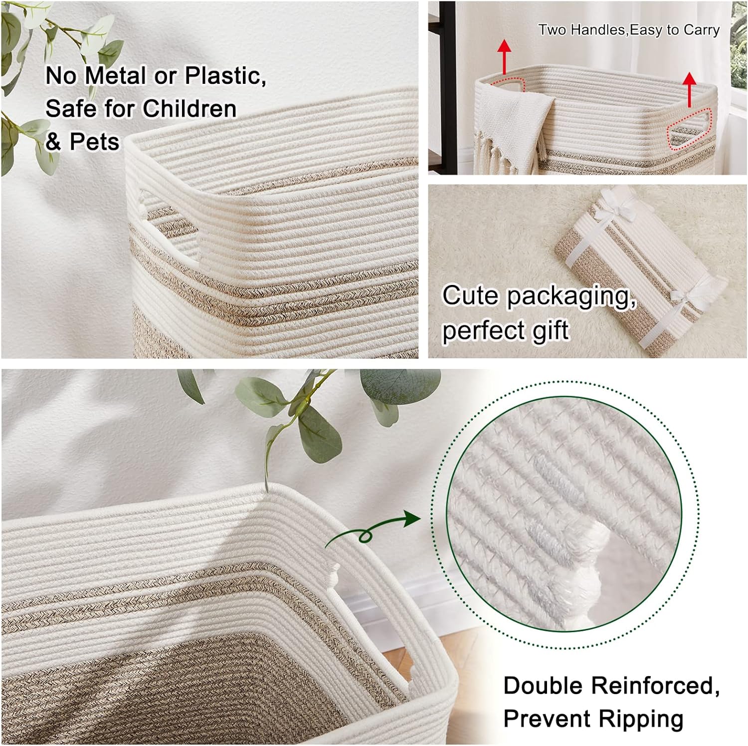 • Double reinforced Handles:We use the highest grade cotton rope as raw material and all the stitches are distribution and fine,which makes the baskets better wear resistance and durability to be used for many years.In addition,each large basket features thick,double stitching around the handles to prevent ripping and keep its shape,never fall off