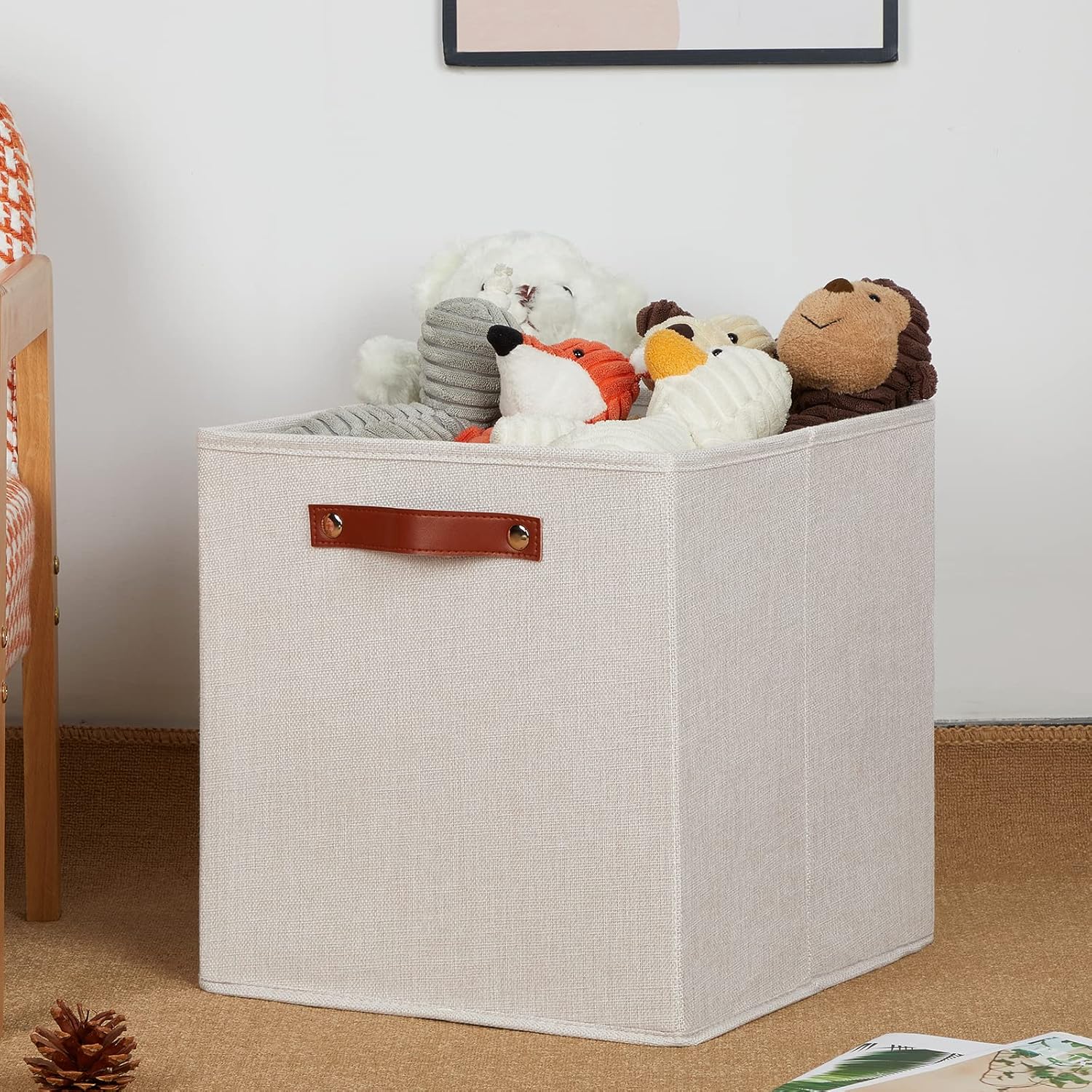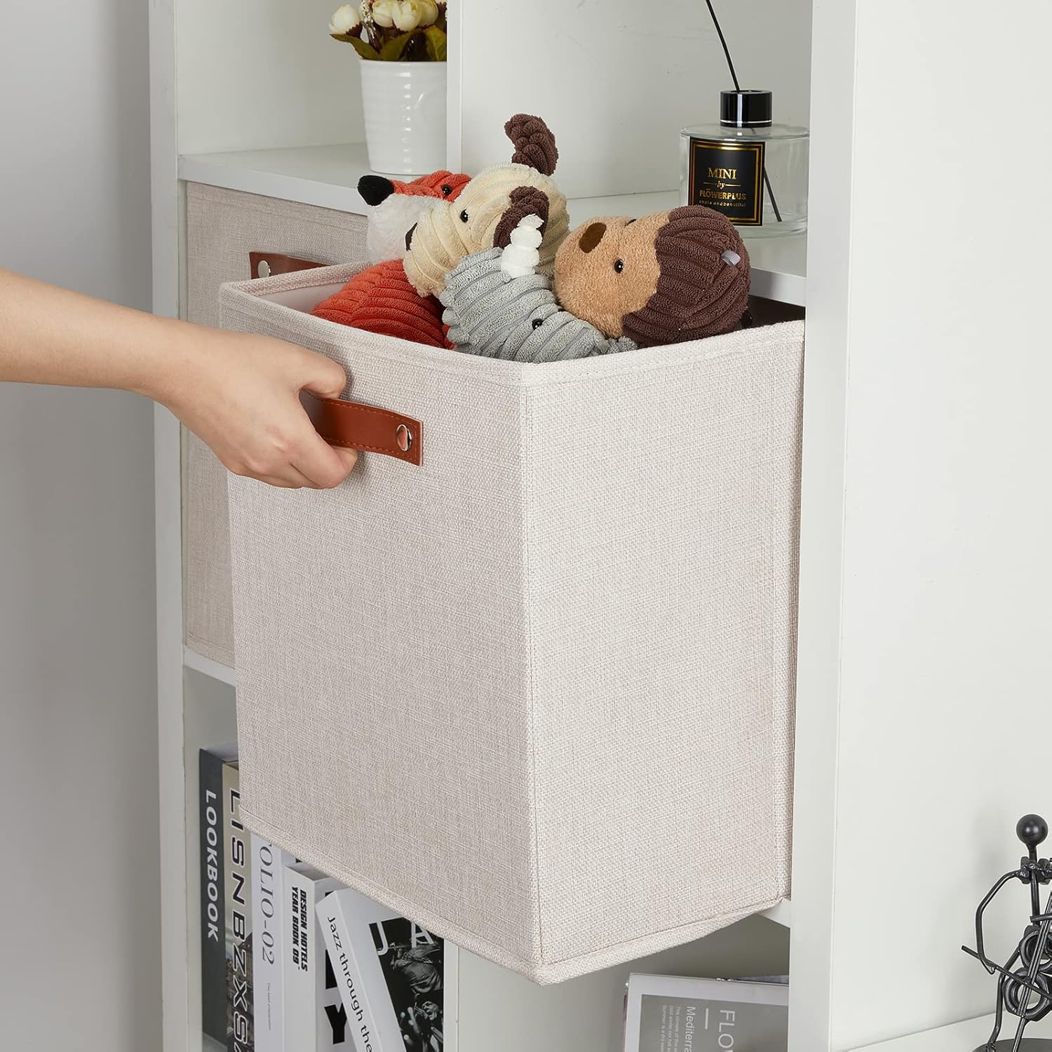 • 【Material】These cube storage bins are constructed of sturdy and attractive linen & cardboard with linen interior lining. The sturdy leather handles make it easy to carry or pull off and out of shelves.