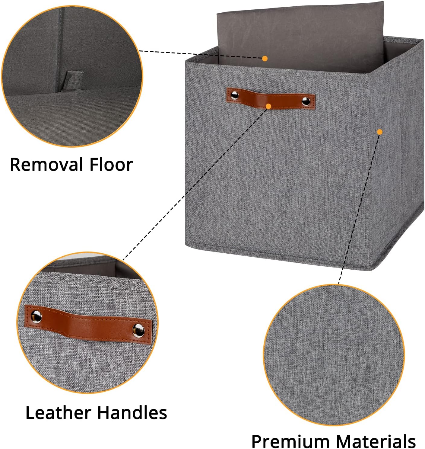 • 【Material】These cube storage bins are constructed of sturdy and attractive linen & cardboard with linen interior lining. The sturdy leather handles make it easy to carry or pull off and out of shelves.