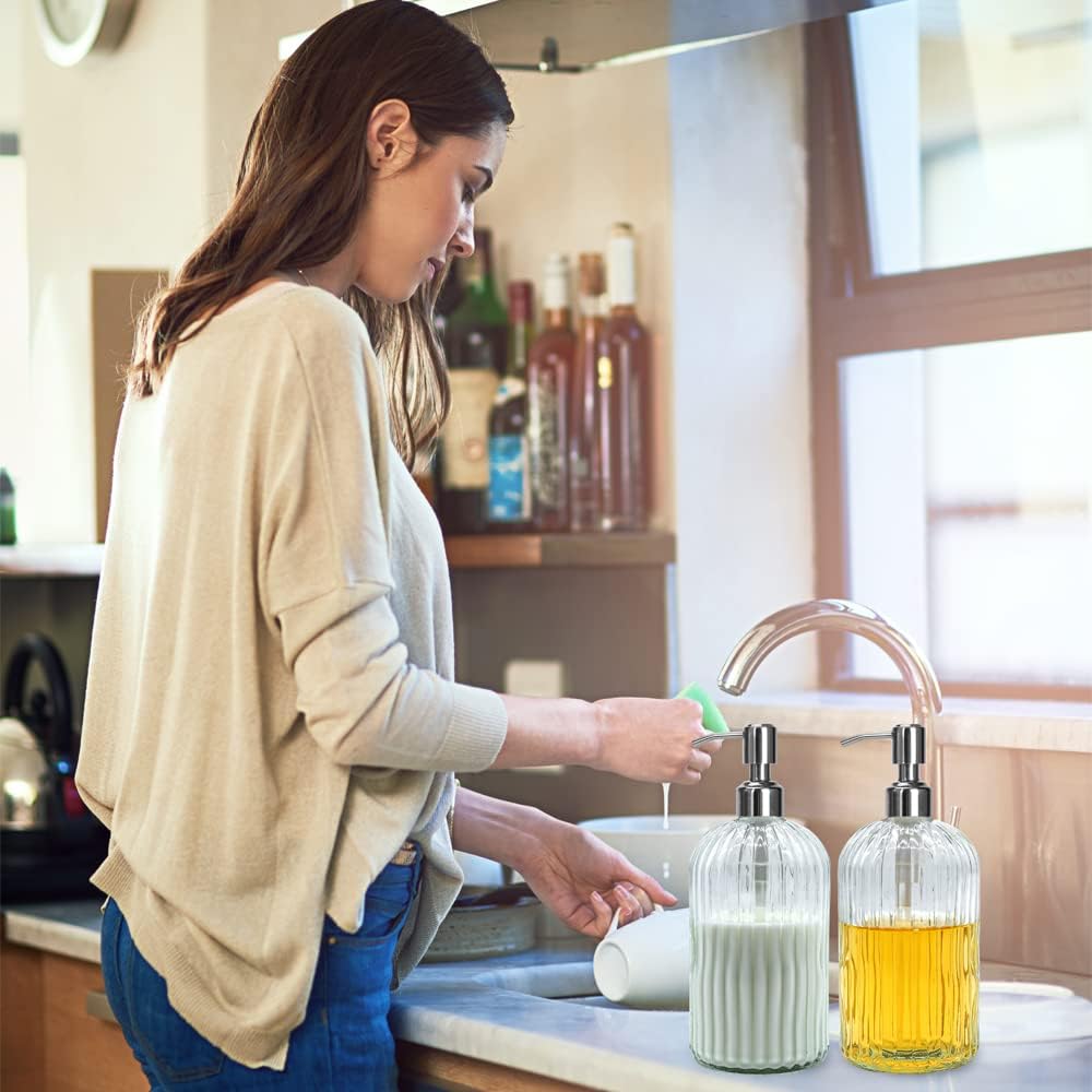 • [High Quality Dish Soap Dispenser]: Made of thickened clear glass bottles and rust-proof stainless steel pump
