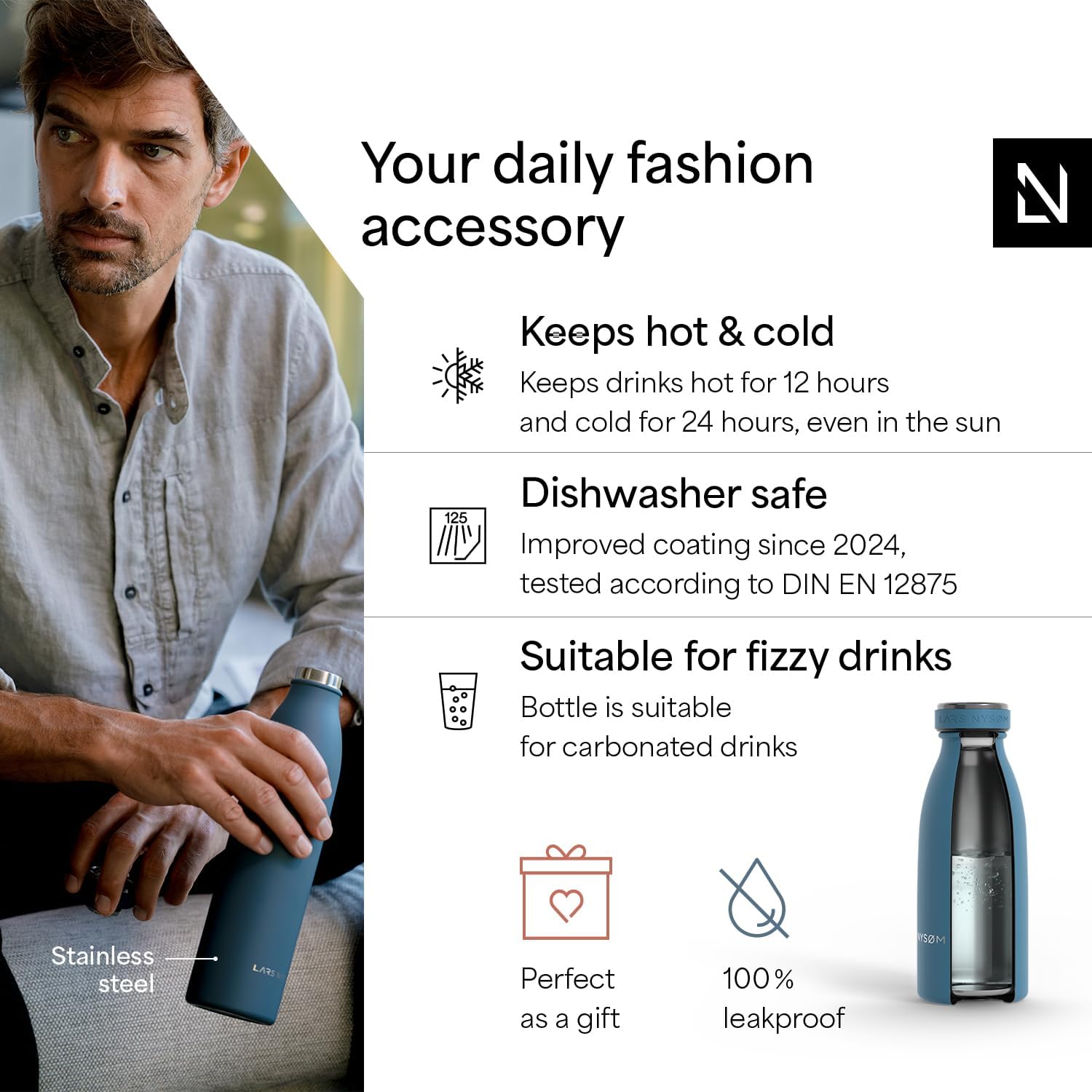 • THERMAL BOTTLE WITH VACUUM INSULATION 12H HOT/24H COLD: The water bottle has a double-wall vacuum insulation and keeps drinks up to 12h hot and 24h cold. Perfect for cold and hot drinks on the go like coffee or tea.