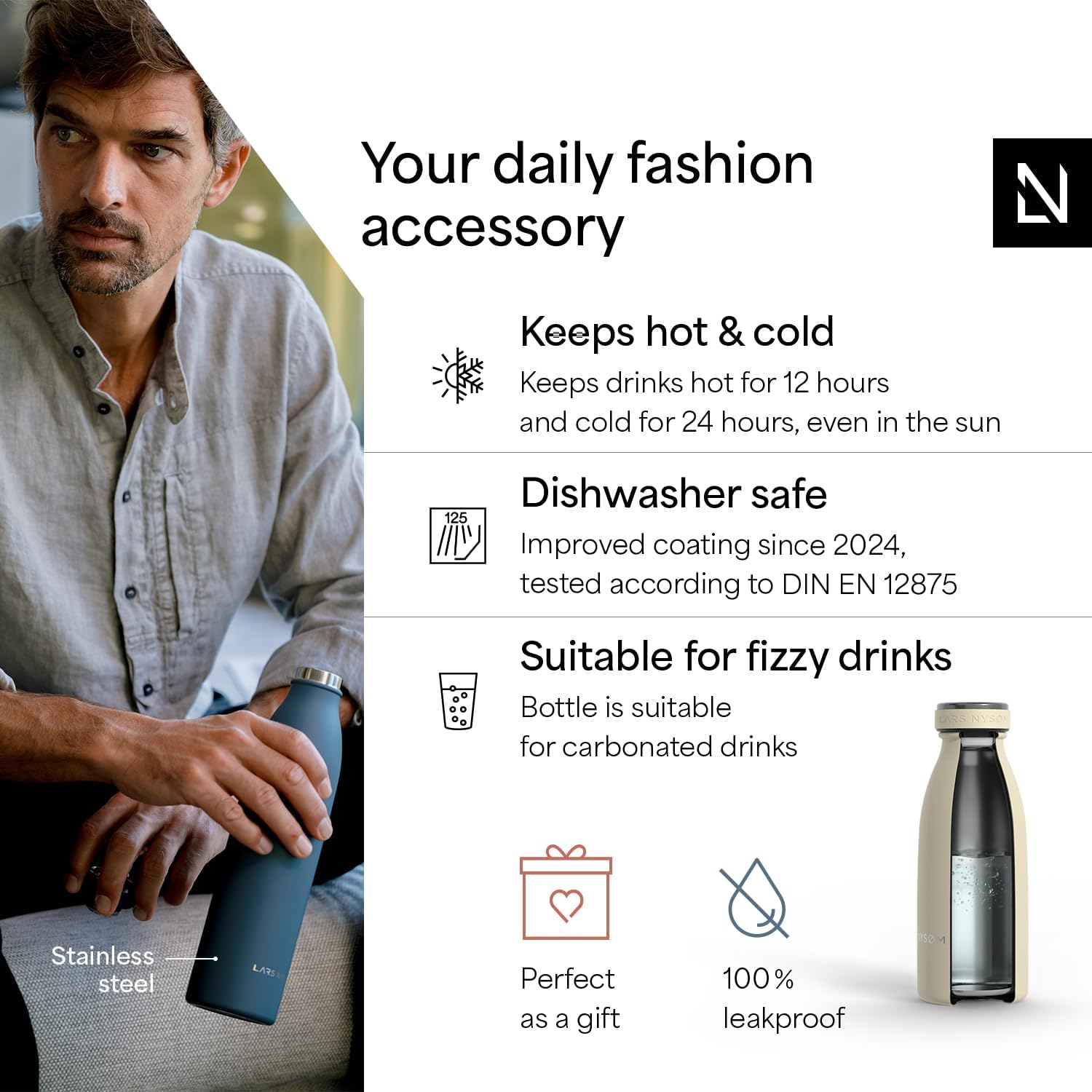 • THERMAL BOTTLE WITH VACUUM INSULATION 12H HOT/24H COLD: The water bottle has a double-wall vacuum insulation and keeps drinks up to 12h hot and 24h cold. Perfect for cold and hot drinks on the go like coffee or tea.
