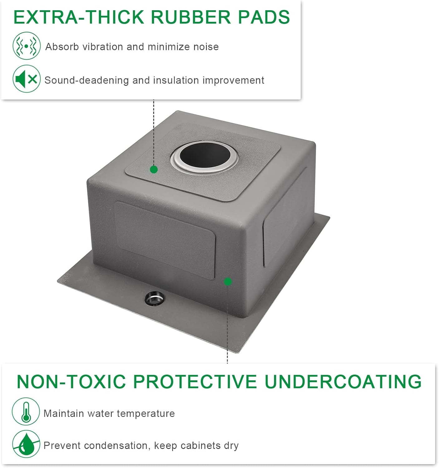 • 【Quiet Kitchen Sink】Thick rubber pads installed on the bottom of this drop in bar sink and with heavy paint coating, the sound of washing and garbage disposal gets appeased and it ultimately protects your cabinet from condensation while draining boiling water