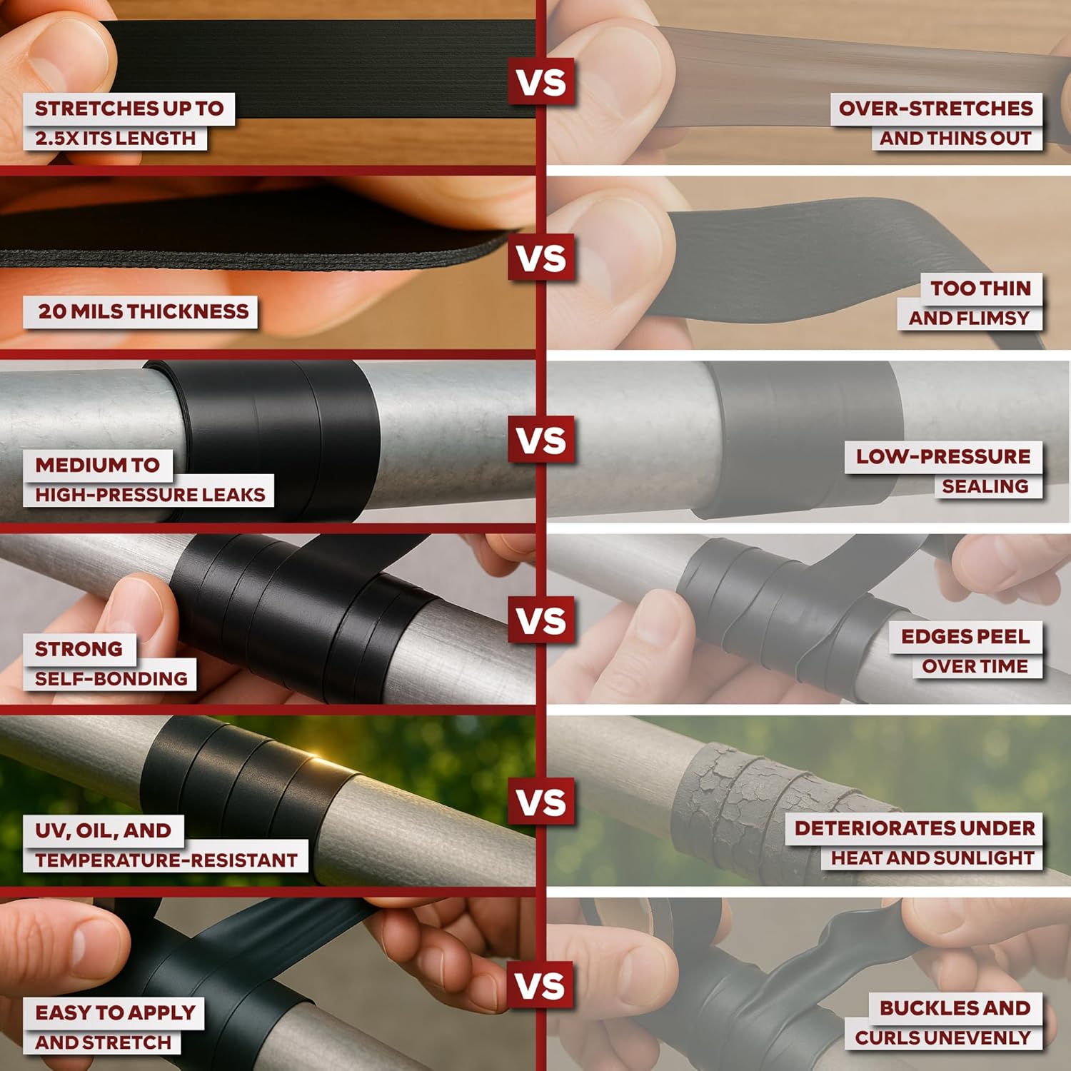 • Flexible. STRETCH THE SILICONE SEALING TAPE UP TO 300% FROM ITS INITIAL LENGTH WHEN APPLYING IT TO ACTIVATE IT. Lengthen while wrapping with 2/3 overlap to ensure that it's appropriately sealed—this pressure sealing guarantees superior water and airtight sealing performance for high-pressure pipe leakages. It also remains flexible even if it's exposed to abrasion and cold temperatures up to -50°C (-60°F).