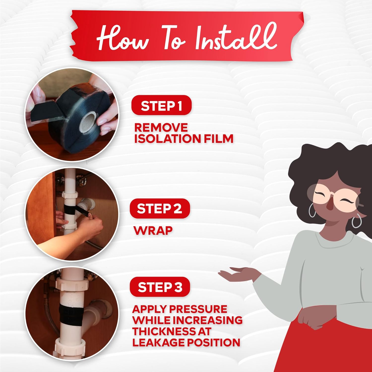 • Flexible. STRETCH THE SILICONE SEALING TAPE UP TO 300% FROM ITS INITIAL LENGTH WHEN APPLYING IT TO ACTIVATE IT. Lengthen while wrapping with 2/3 overlap to ensure that it's appropriately sealed—this pressure sealing guarantees superior water and airtight sealing performance for high-pressure pipe leakages. It also remains flexible even if it's exposed to abrasion and cold temperatures up to -50°C (-60°F).