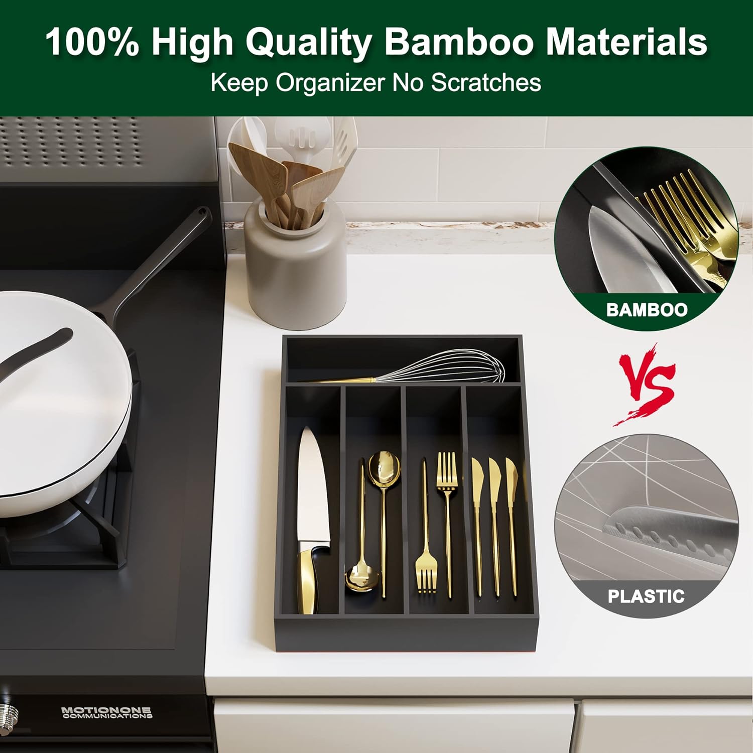 • 【Made of natural bamboo】Our flatware organizer is made of natural bamboo. The material is taken from bamboo that have grown for more than 4 years which make our silverware holder for drawer use a durable kitchen piece that ll last you for years. The Environmentally material keep our flatware & utensil water and odor resistant. Even the knife won't leave scratch on it.
