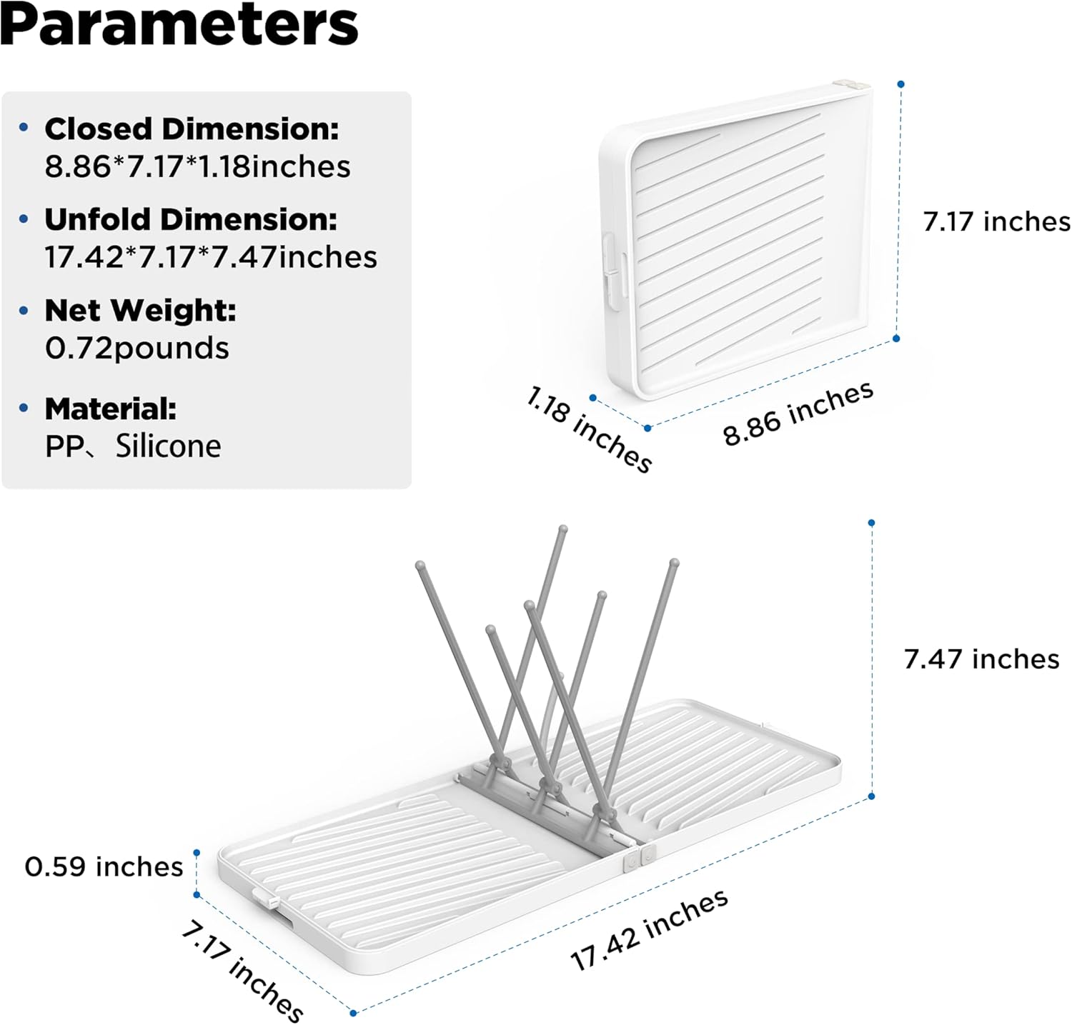 • ✈【Foldable Design】The size of the portable bottle drying rack for baby bottles is ‎‎17.42 x 7.17 x 0.59 inches when opened for use. It can be folded for storage when traveling or when not in use, and it measures only 8.86 x 7.17 x 1.18 inches when folded.