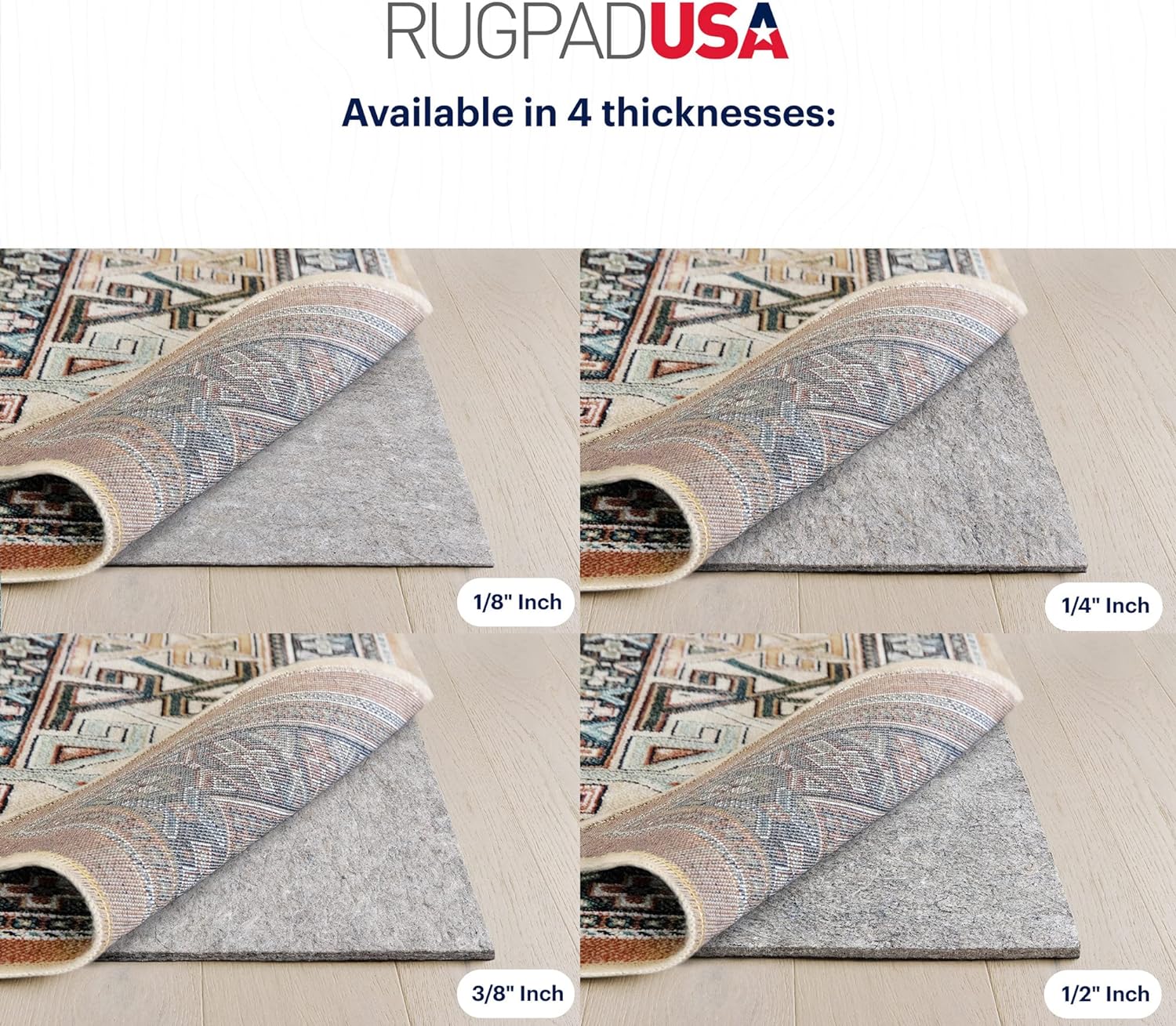 • DURABLE CUSHION - Pad contains 32oz of felt and 14oz of rubber per square yard. Thickness is approximately 3/8" throughout (actual thickness may vary slightly in production). Heat pressed felt adds soundproofing and insulation. Non-abrasive to protect rugs and floors from scratches. Adds extra comfort underneath rugs.
