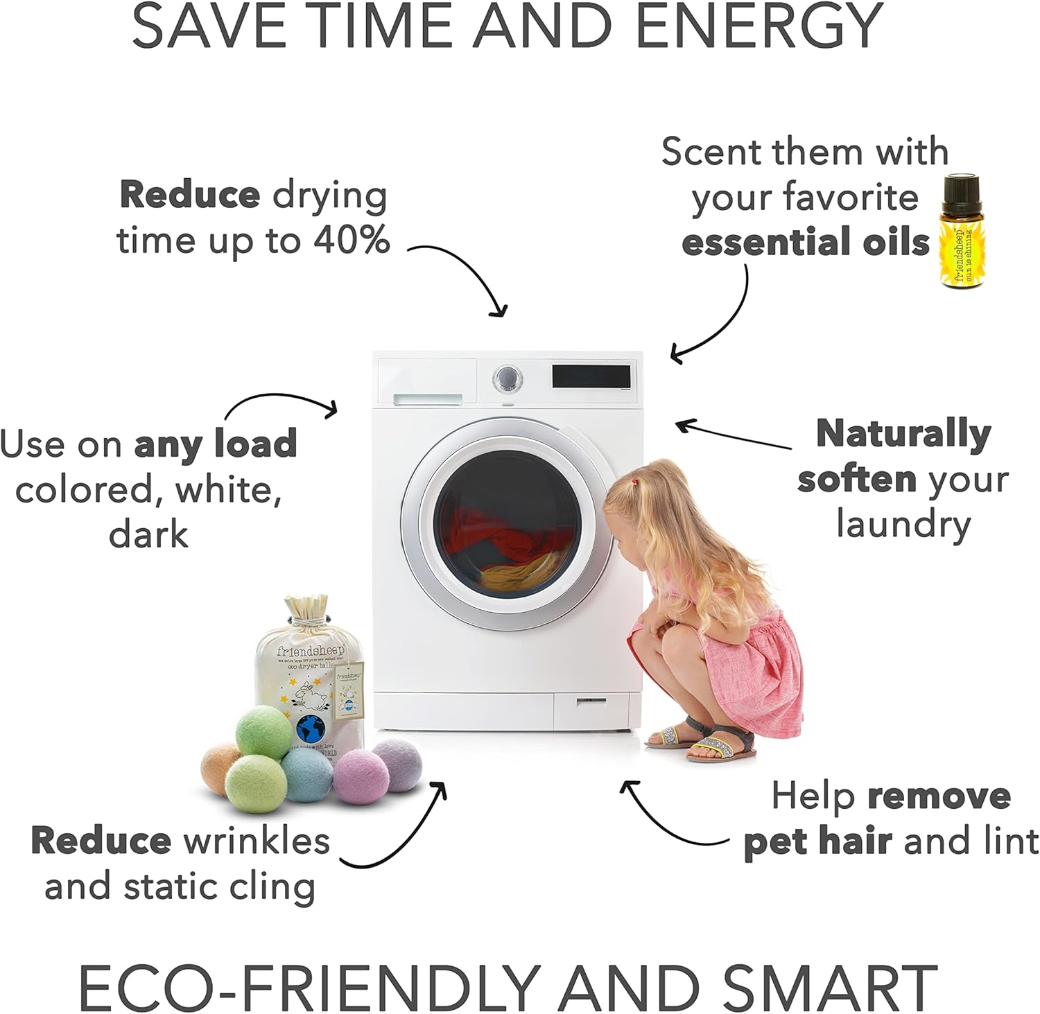• ECO-FRIENDLY AND REUSABLE FOR 1000+ LOADS, replaces dryer sheets & liquid fabric softeners. Makes your laundry soft and fluffy, reduces wrinkles and static cling, and shortens drying time by up to 40% depending on load size. Your sheets and towels are fluffier, less balling and twisting. Makes you SAVE TIME, ENERGY, AND MONEY! All by keeping safe and healthy you, your family and the environment.