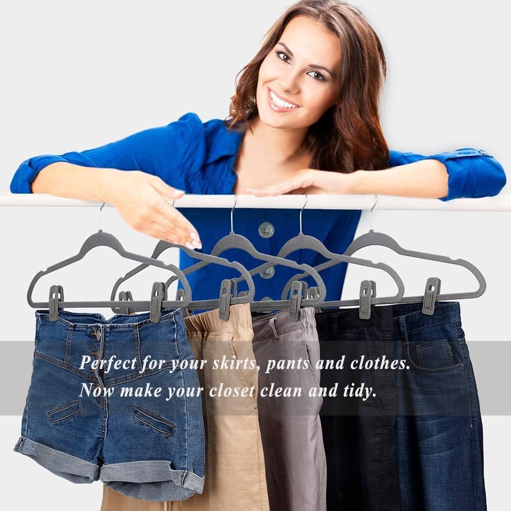 • ✅ PREFECT FOR YOUR CLOSET - The grey velvet clips are fixed to the velvet hangers to provide you with more closet space and keep your clothes tidy