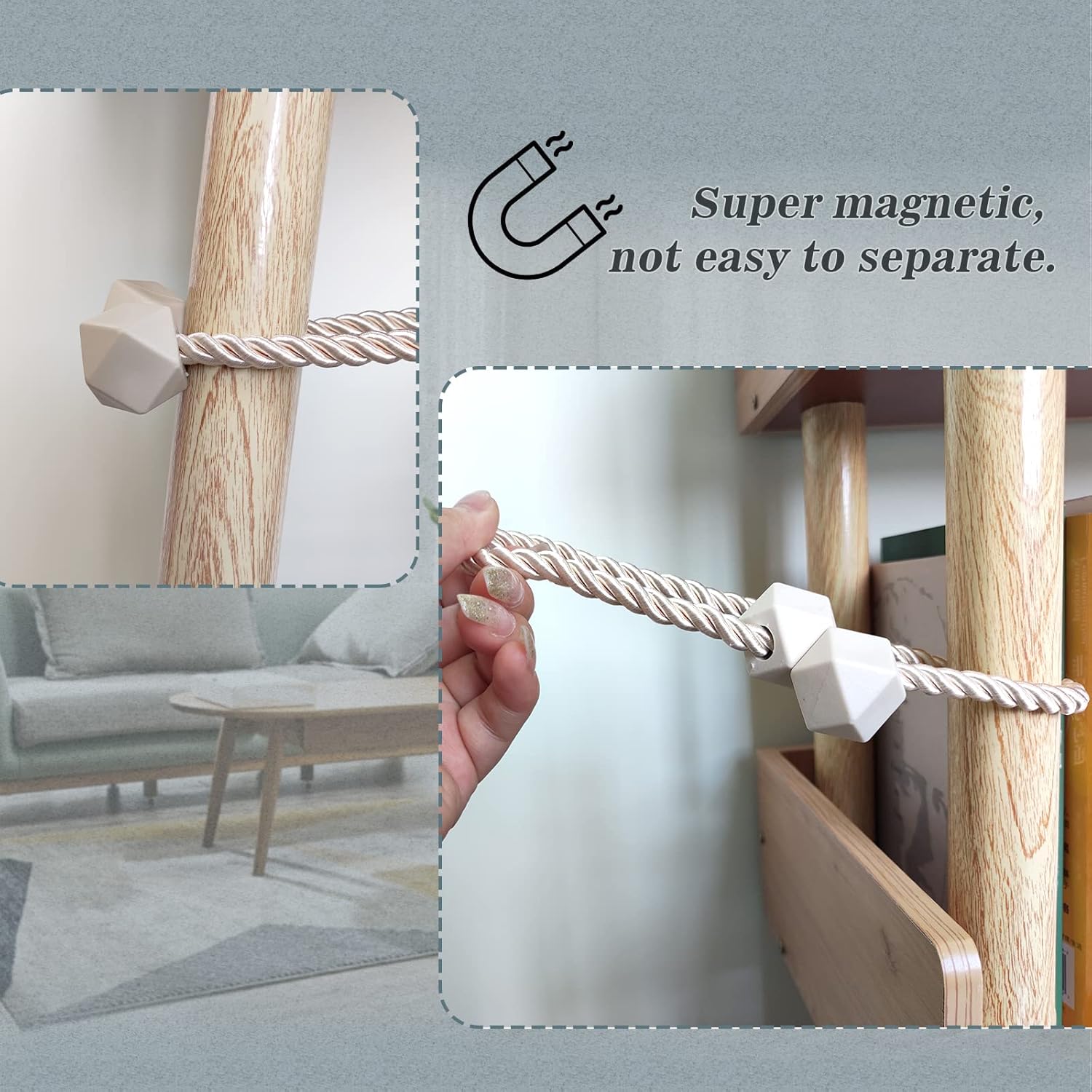 • 🌛[Upgrade Powerful Magnetic] Our magnetic curtain tiebacks magnets use high-end new imported nickel-plated magnets, with strong corrosion resistance and durability, more magnetic than ordinary magnetic curtain tiebacks, and do not rust and not lose color. The rope of curtain tie adopts upgrade thickened solid polyester yarn, which is not only durable, but also not easy to wear or pilling.
