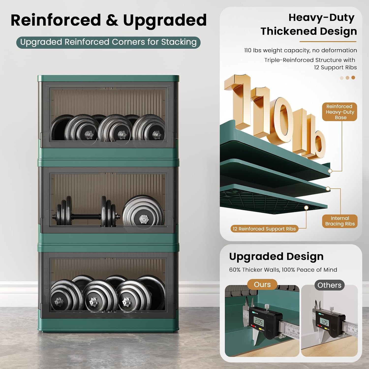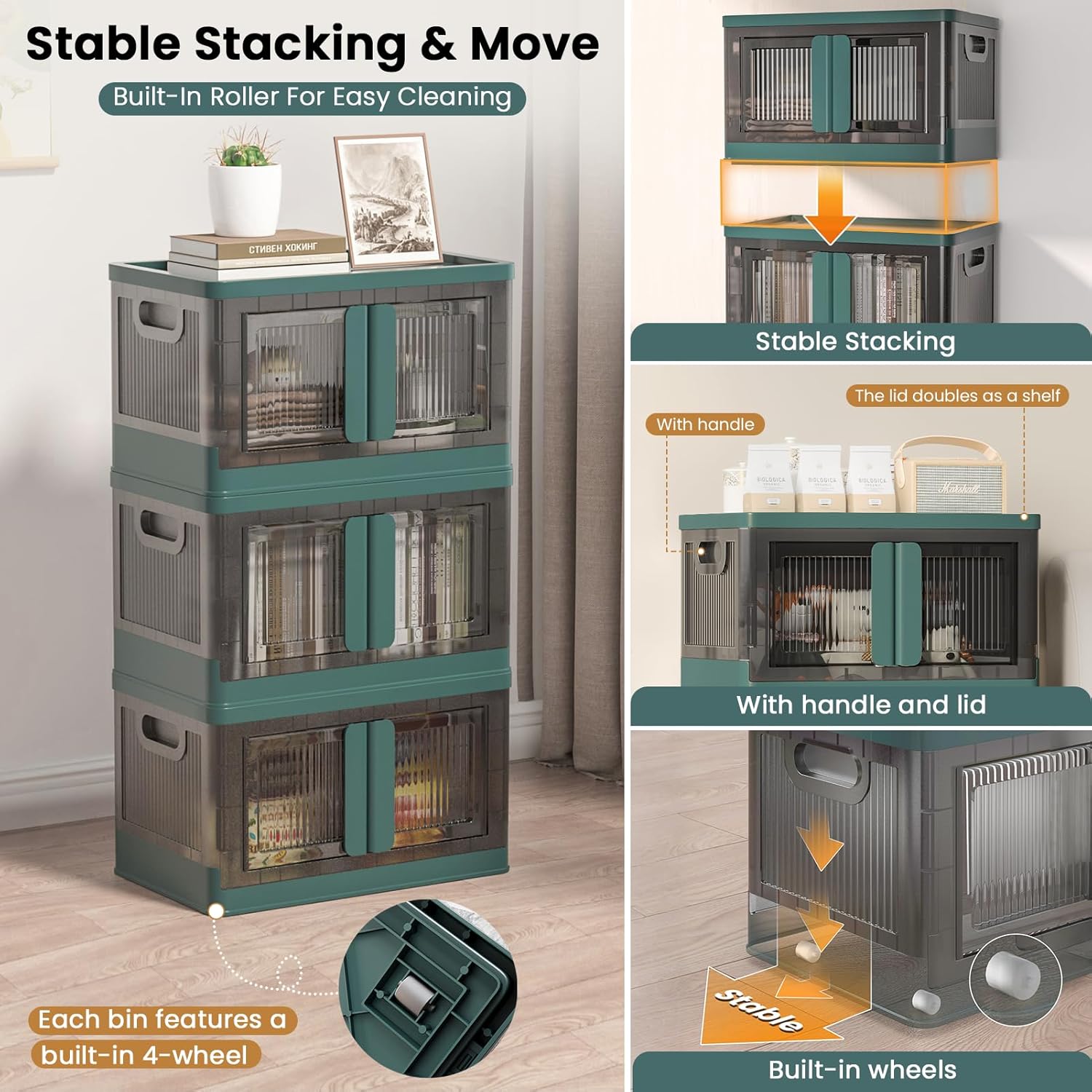 8.4Gal Collapsible Storage Bins with Lids & Wheels - 3 Pack Stackable with Doors, Heavy-Duty Plastic Containers for Home/Office, Green