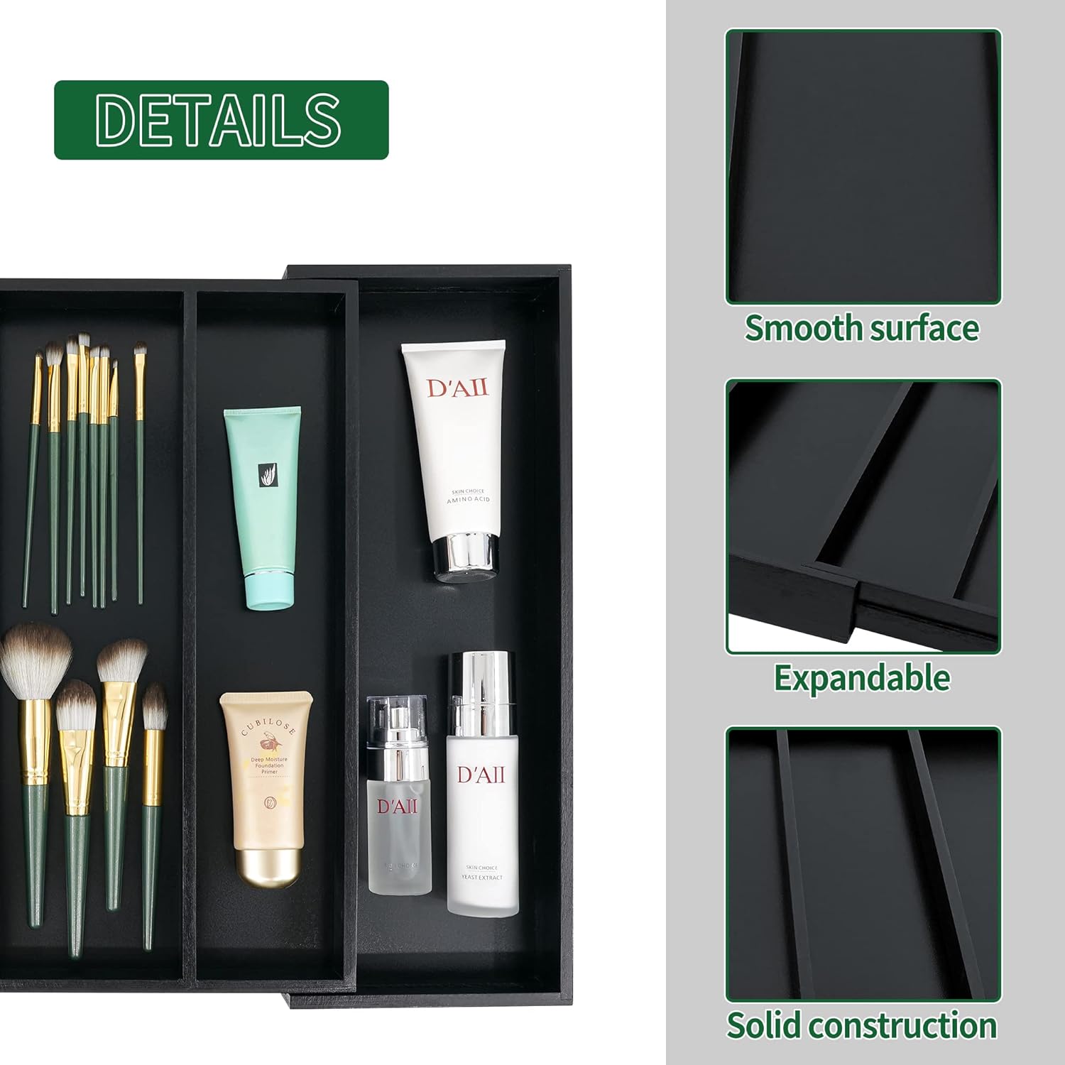 • Widely Use: The expandable drawer organizer can be used to store small items such as jewelry, tools, spoons and knives. also it can be made a good use in the bedroom or bathroom with holding personal items like hair ties, jewelry and other accessories