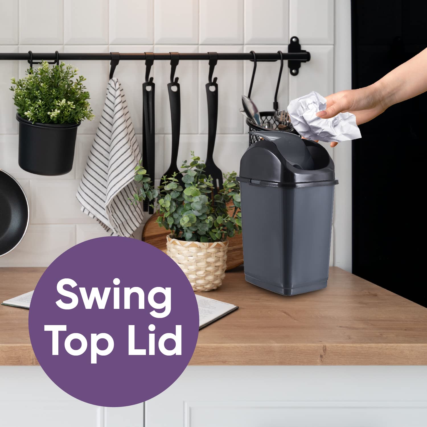 • VERSATILE BIN: Use this trashcan to dispose of peels, dirt, lint, papers, and tea bags, or to store small stuff such as crafts, tools, cleaning supplies, and more…