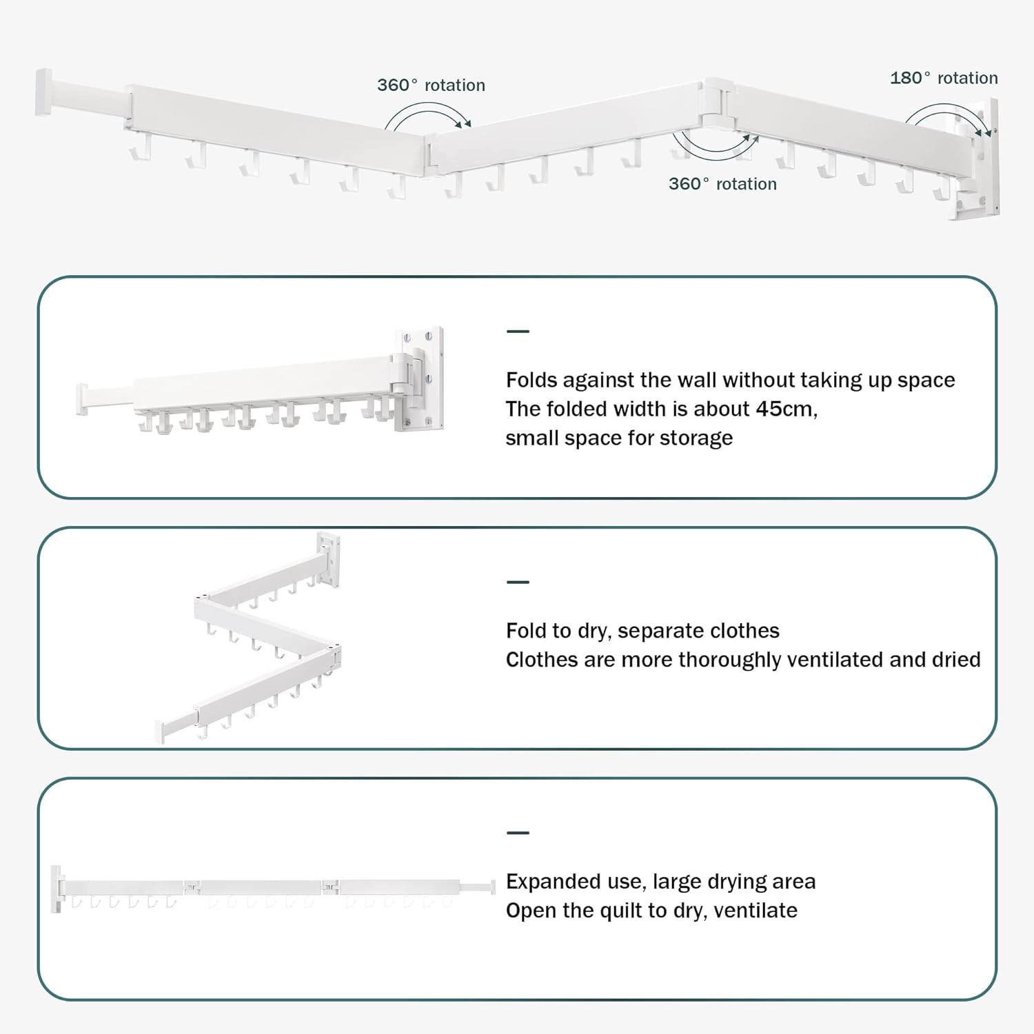 Wall Mounted Clothes Drying Rack, Collapsible, Folding, Retractable - Clothes Hanging Rack (Hooks, White)