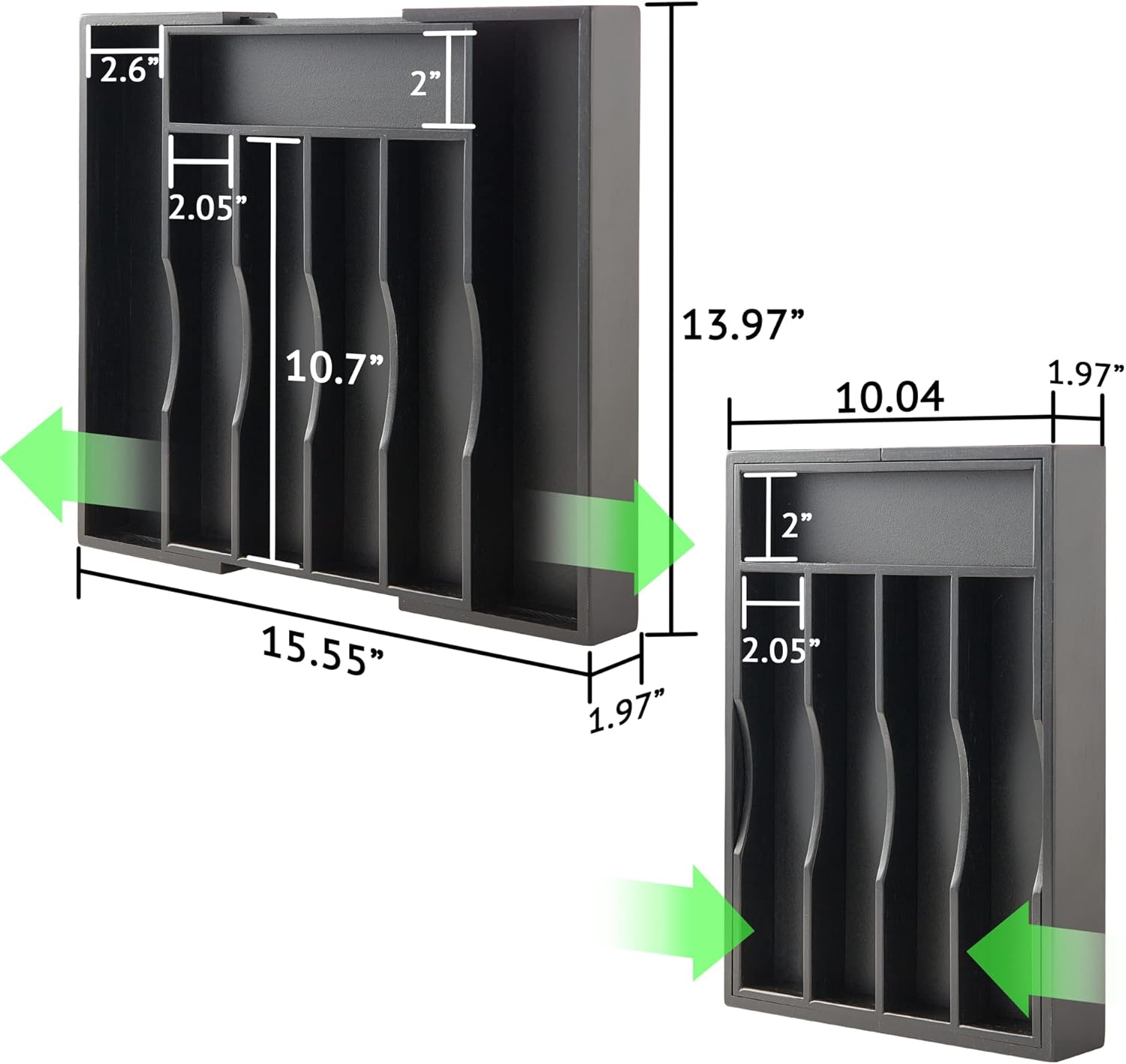 • [TWO-PIECE SET]: This 2-Piece 10.04" - 15.5" wide, 13.98" long and 1.97" deep bamboo drawer organizer can tame your out-of-control kitchen drawers, to store and organize the cutlery and kitchen utensils according to your rules, and maximize the drawer storage. Keep everything accessible and organized, so that you don't have to rifle around for your cooking tools. Beautiful and practical kitchen drawer organizer turns the cooking and tasting into things of beauty and efficiency.