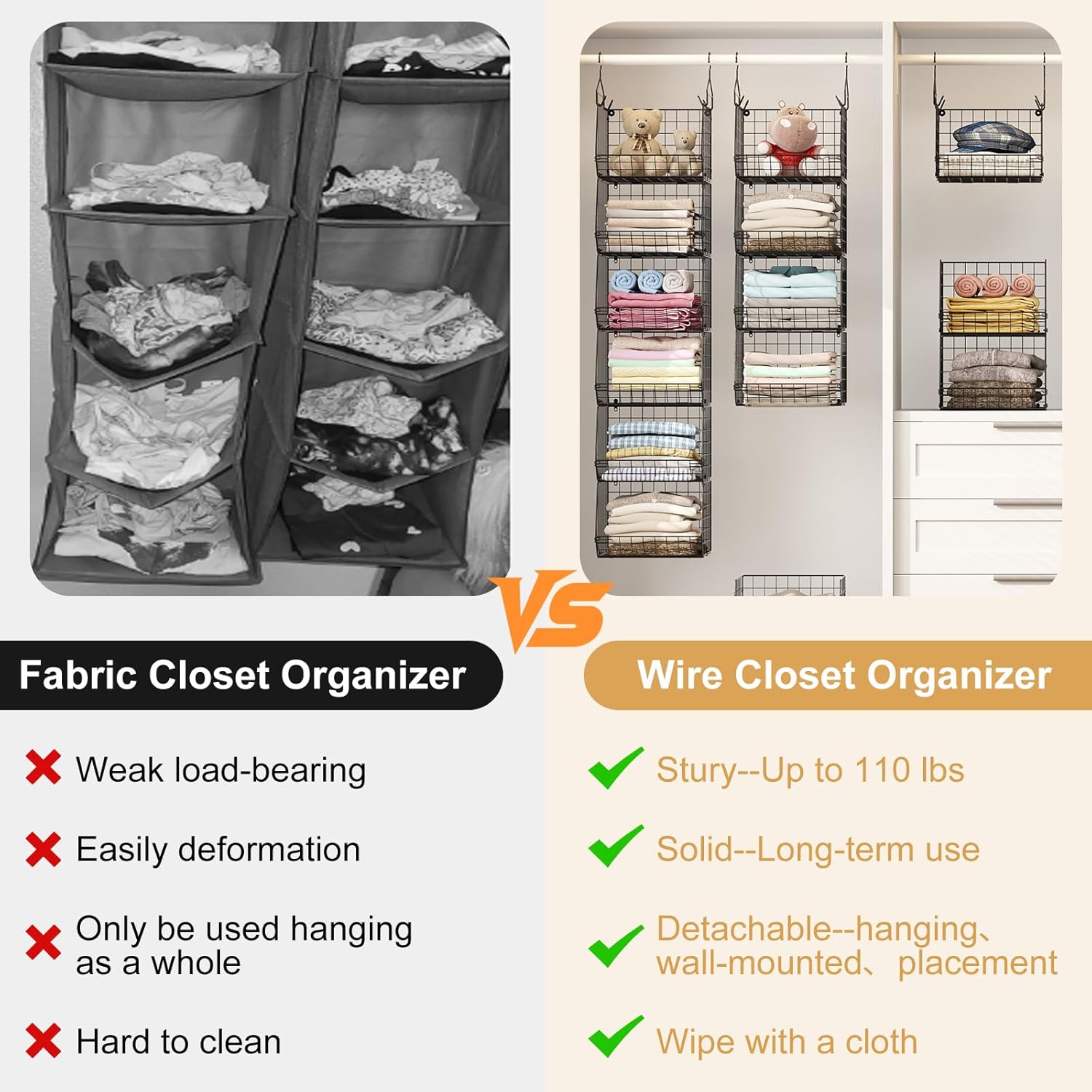 • 👜Perfect Storage Organization: 6 tier wide open wire basket allows you to easily view, put in and take off more easily. X-cosrack metal basket hanging shelves provide a great storage solution for any room in the home. Organize clothes accessories and toys in your closet, lotions in your bathroom, containers in your pantry, office supplies, mails in your office, fruit&vegetable&spices in your kitchen.