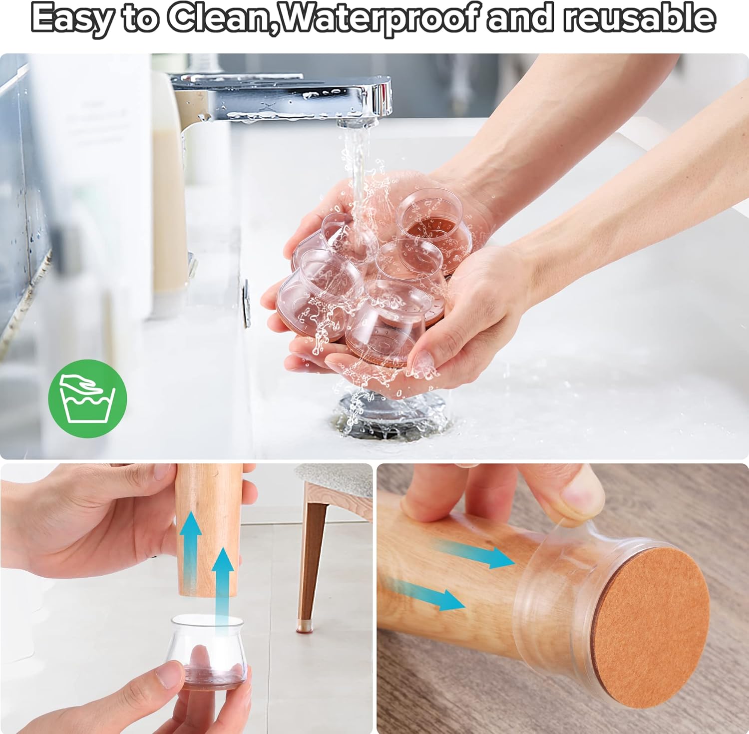 • ✅【Easy to Use】The chair leg covers to protect floors has high transparency, which greatly restore the original color of the table and chair legs, look more natural. The furniture leg cap is easy to install, without the use of tools. When the furniture chair socks are dirty, the chair stoppers can be cleaned and used repeatedly. Mainly suitable for smooth floors such as hardwood, tile, composite floor, and vinyl floor. Clear cap style match with most floors.