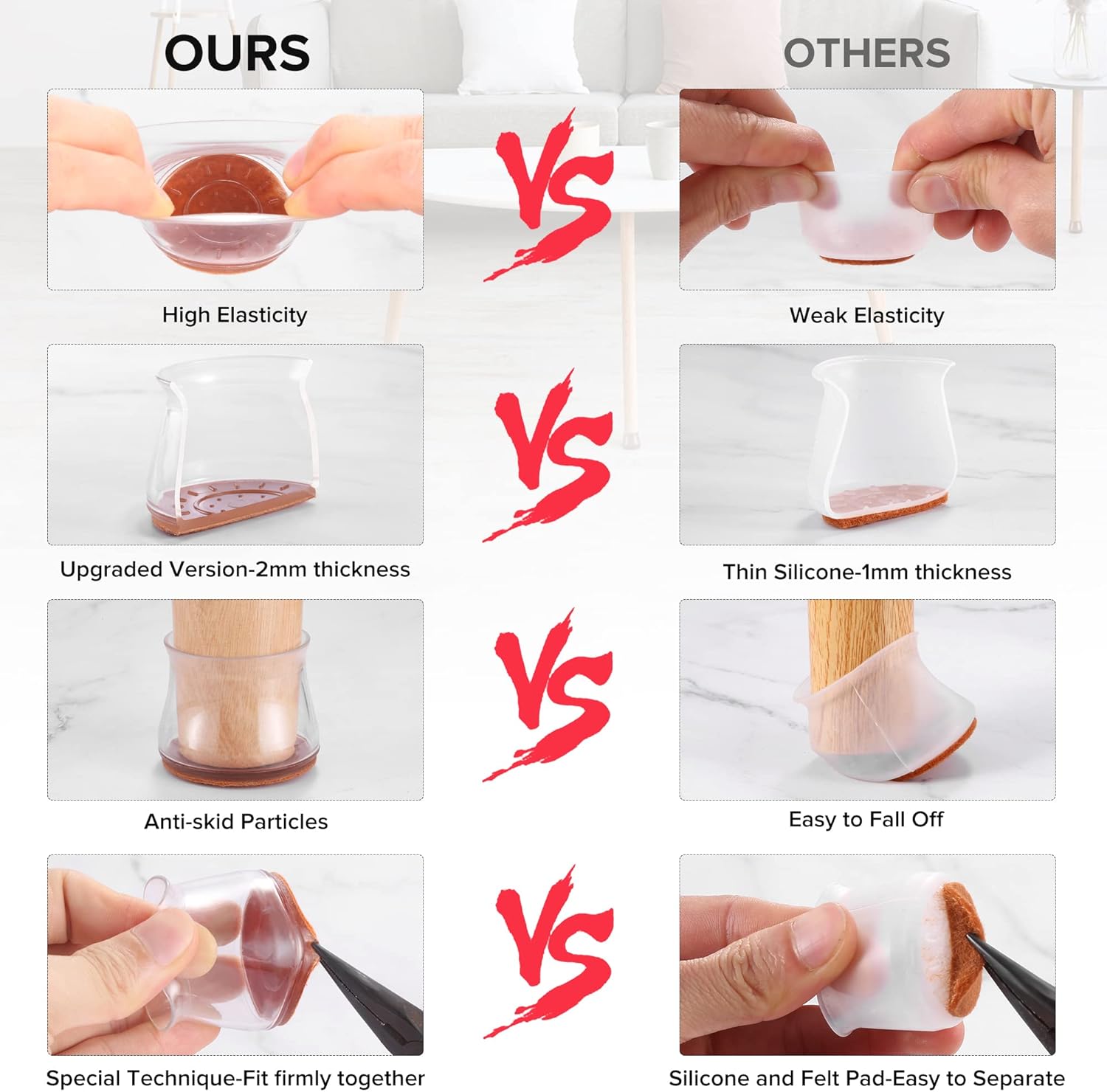 • ✅【Latest Upgrade】Compared with most of the traditional 1mm furniture pads on the market, our chair leg floor protectors are made of 2mm thick silicone, which will never be damaged, durable. The chair leg protectors will not change color when stretched. Inside of the inner sleeves are particles with anti-slip, which will firmly fix the chair and never make the covers fall off. Felt pads at the bottom make your furniture move silently and smoothly along floors without leaving marks and noise.