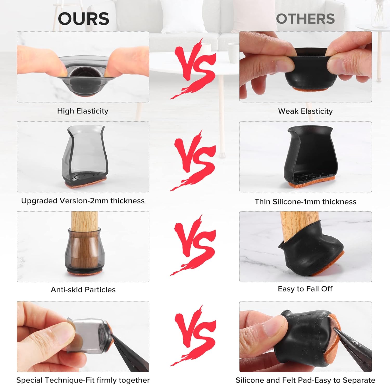 • ✅【Latest Upgrade】Compared with most of the traditional 1mm furniture pads on the market, our chair leg floor protectors are made of 2mm thick silicone, which will never be damaged, durable. The chair leg protectors will not change color when stretched. Inside of the inner sleeves are particles with anti-slip, which will firmly fix the chair and never make the covers fall off. Felt pads at the bottom make your furniture move silently and smoothly along floors without leaving marks and noise.