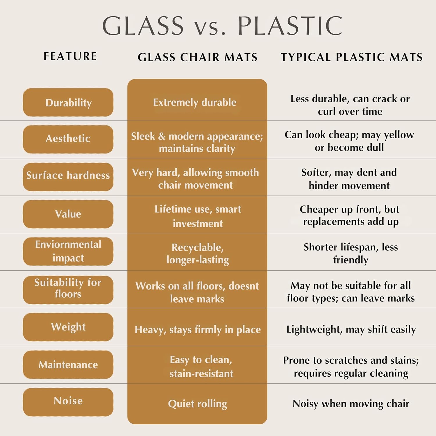 • π—¦π—§π—¬π—Ÿπ—œπ—¦π—› 𝗣π—₯π—’π—§π—˜π—–π—§π—œπ—’π—‘ - Stylish tempered glass chair mat with a maximum capacity of up to 1000 pounds ensures that your floors will be protected from scuffs and damage typically caused by hard plastic rolling office chair wheels. This elegant ergonomic tempered glass mat can work on carpet with ease or over hard floors such as tile, wood, and vinyl flooring.