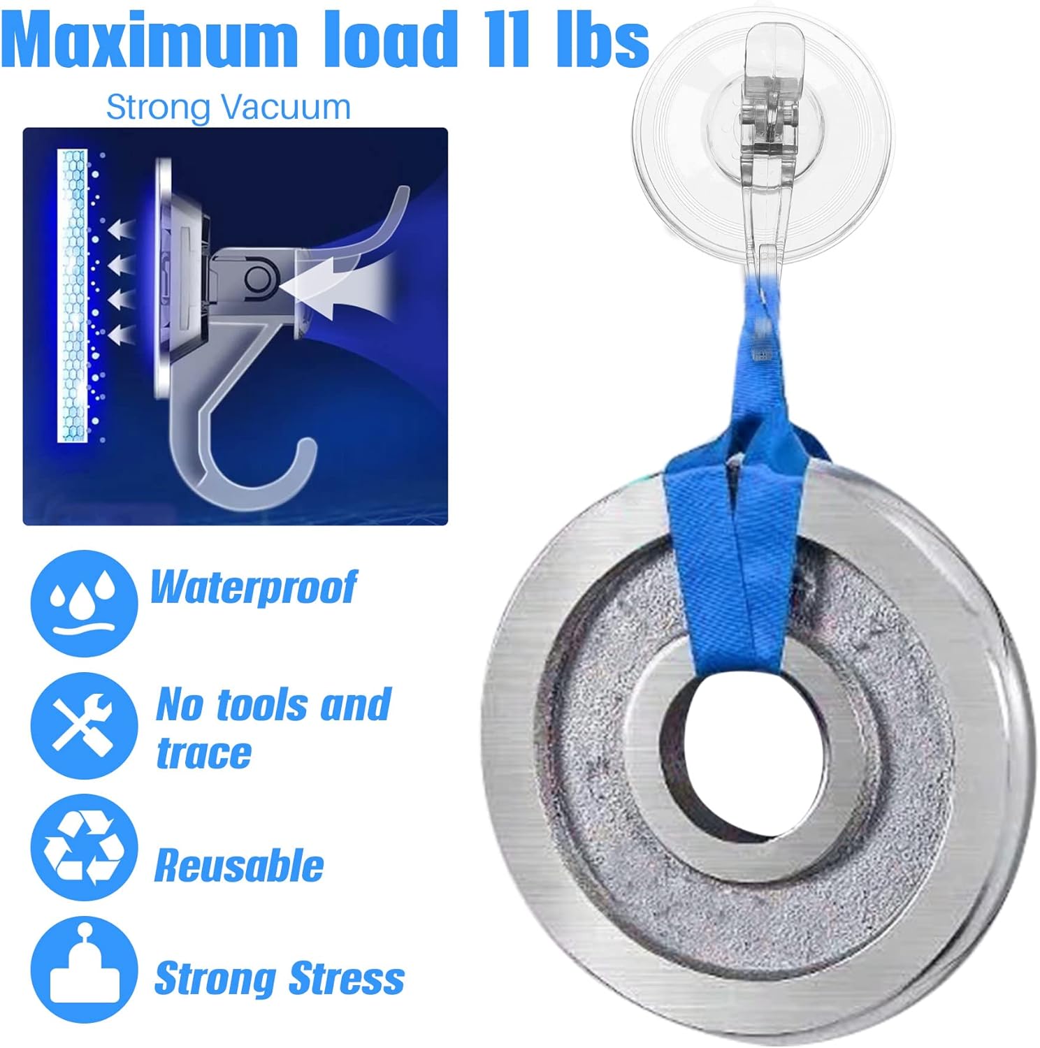 • PATENT-PENDING Dual Hooks Design【Strong Suction Power Holds up to 11 lbs on Smooth Surface】Vacuum Suction Hooks Water-resistant and Reusable. The double hook is bigger so that it is not limited to hanging small objects. Transparent design certain a convenient and versatile style