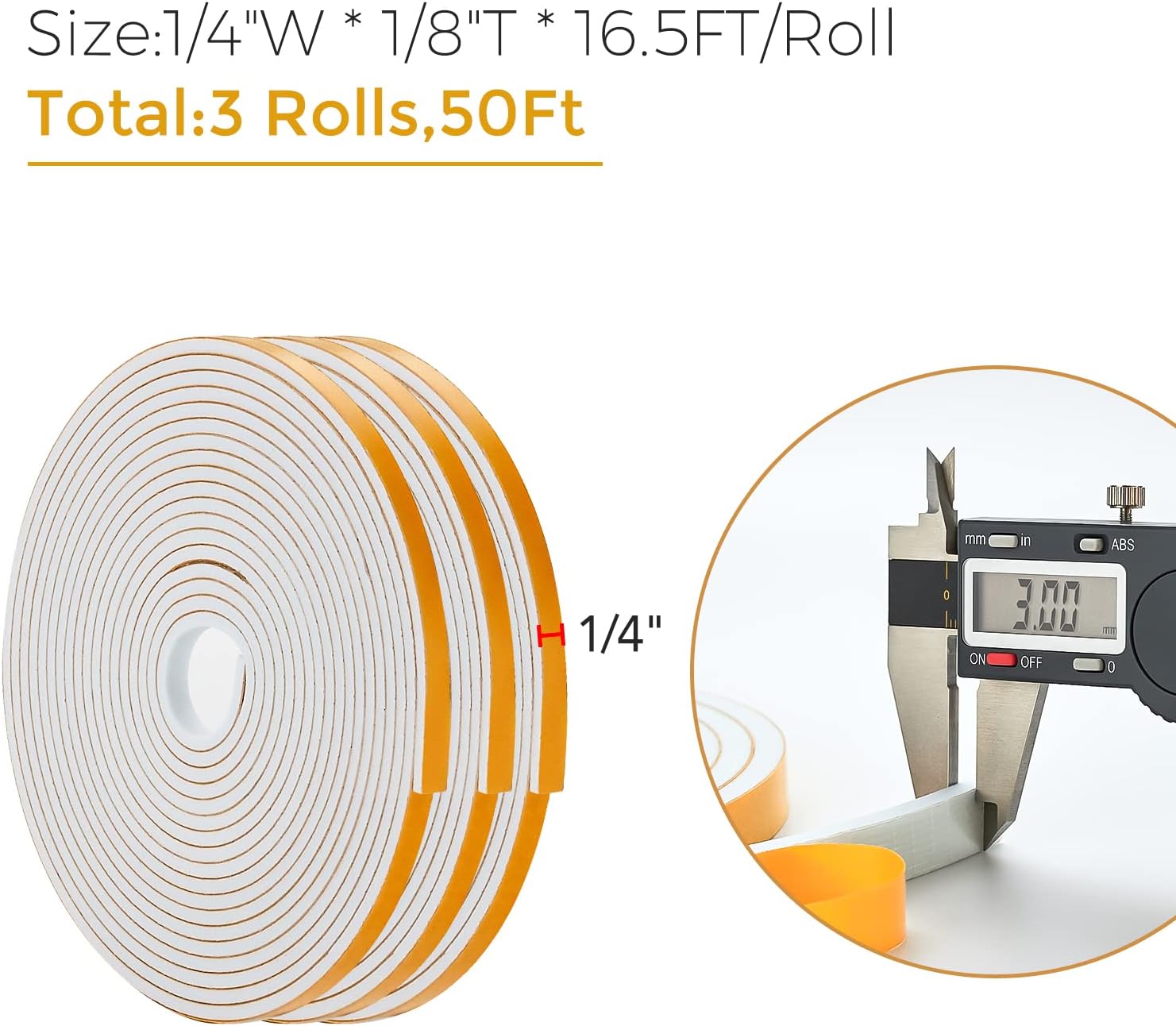 • Dimensiones: 1/4"W * 1/8"T * 16.5FT/Roll, you will get 3 rolls, total 50FT. You can use the blade to cut the window weather stripping to any length you need.