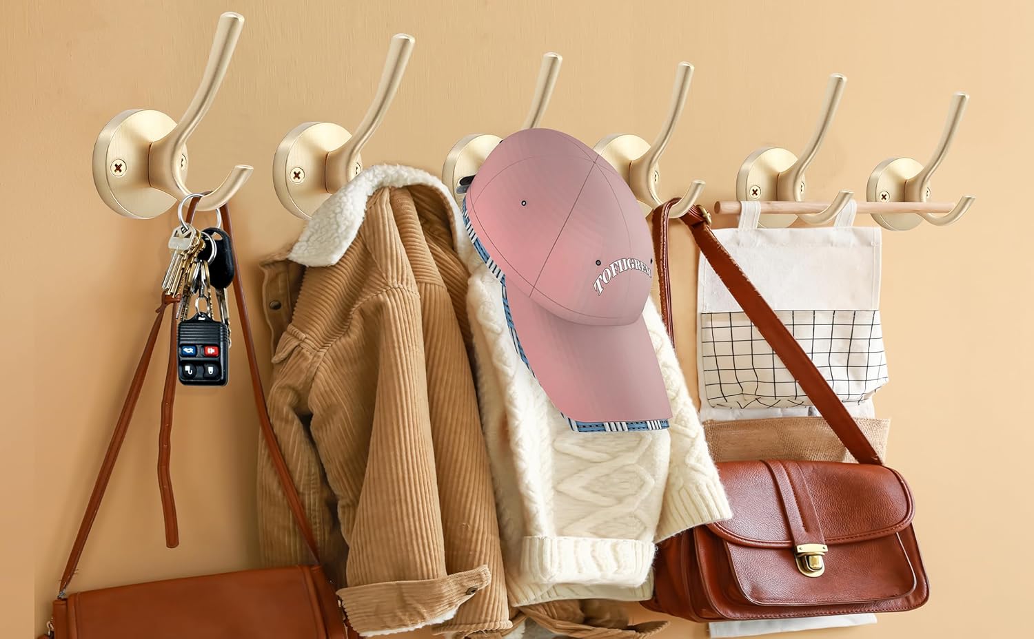 • 【Great quality material and sturdy】This heavy duty gold wall hooks are made of high quality solid zinc alloy, have thicker hook base, hard, durable and rust-proof, strong enough to hang 40 lbs items, suitable for hanging heavy objects such as clothes, backpack,towel,flower basket,key, or jewelry .