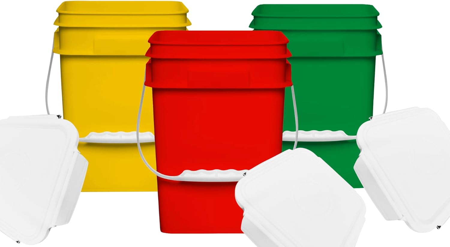 House Naturals 4 Gallon Square Food Grade Bucket Pail with Plastic Handles and Lid (Pack of 3) Made in USA containers (Yellow-Green-Red)