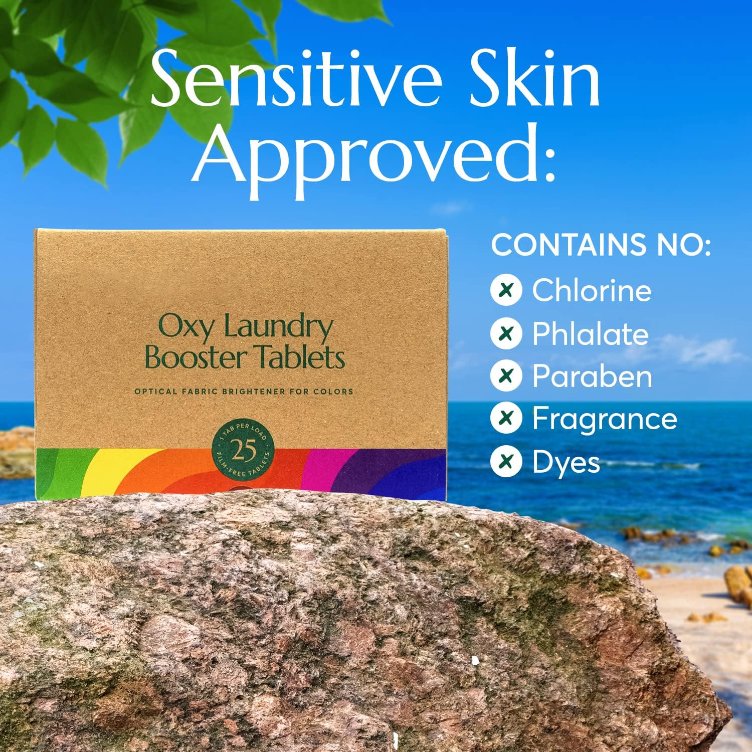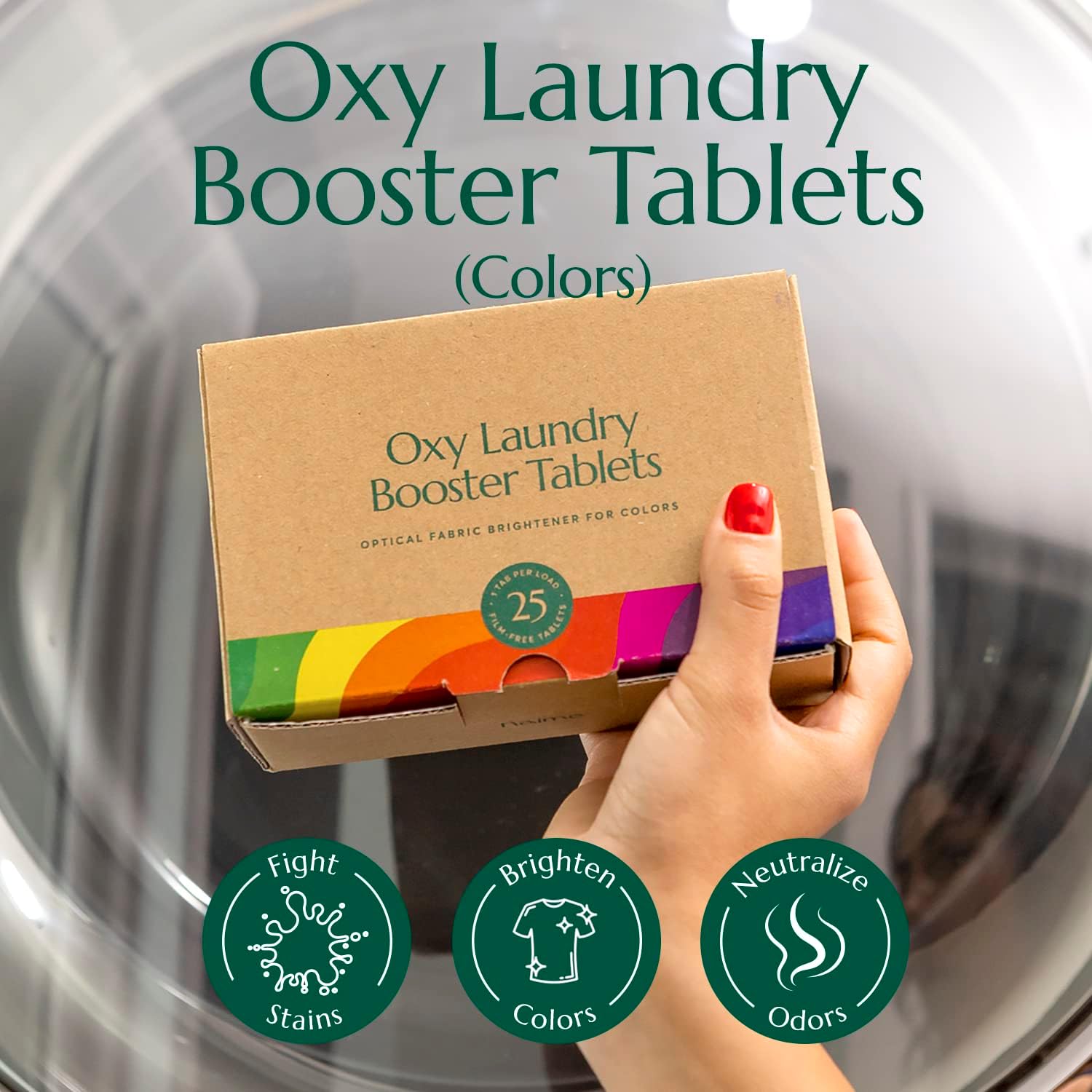 • First, add one Oxy Laundry Booster Tablet into your washer, then add clothes and Earthwash or your favorite detergent. Finally, wash as normal and enjoy your revived and brightened wardrobe with our laundry whitener brightener!