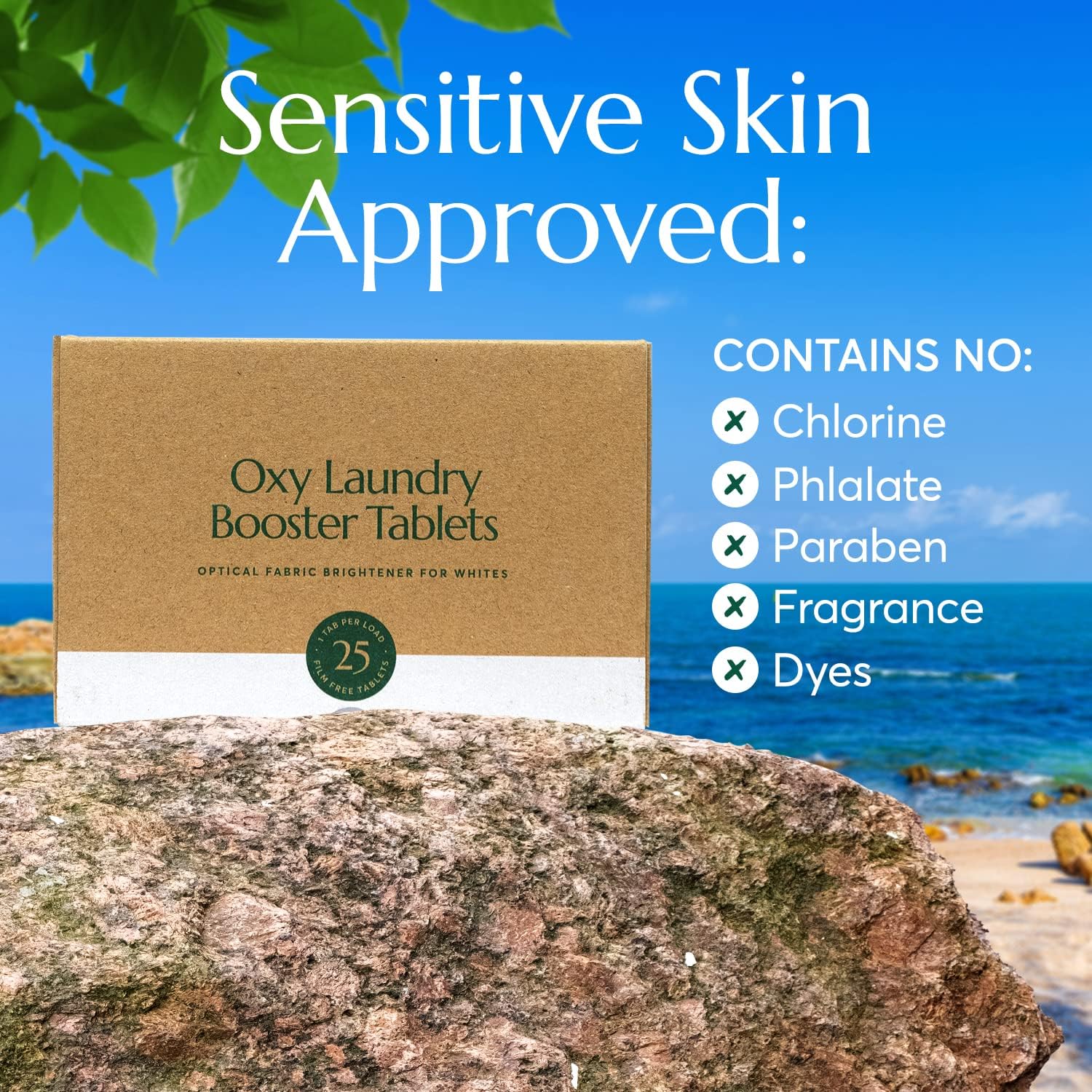 • First, add one Oxy Laundry Booster Tablet into your washer, then add clothes and Earthwash or your favorite detergent. Finally, wash as normal and enjoy your revived and brightened wardrobe with our laundry whitener brightener!