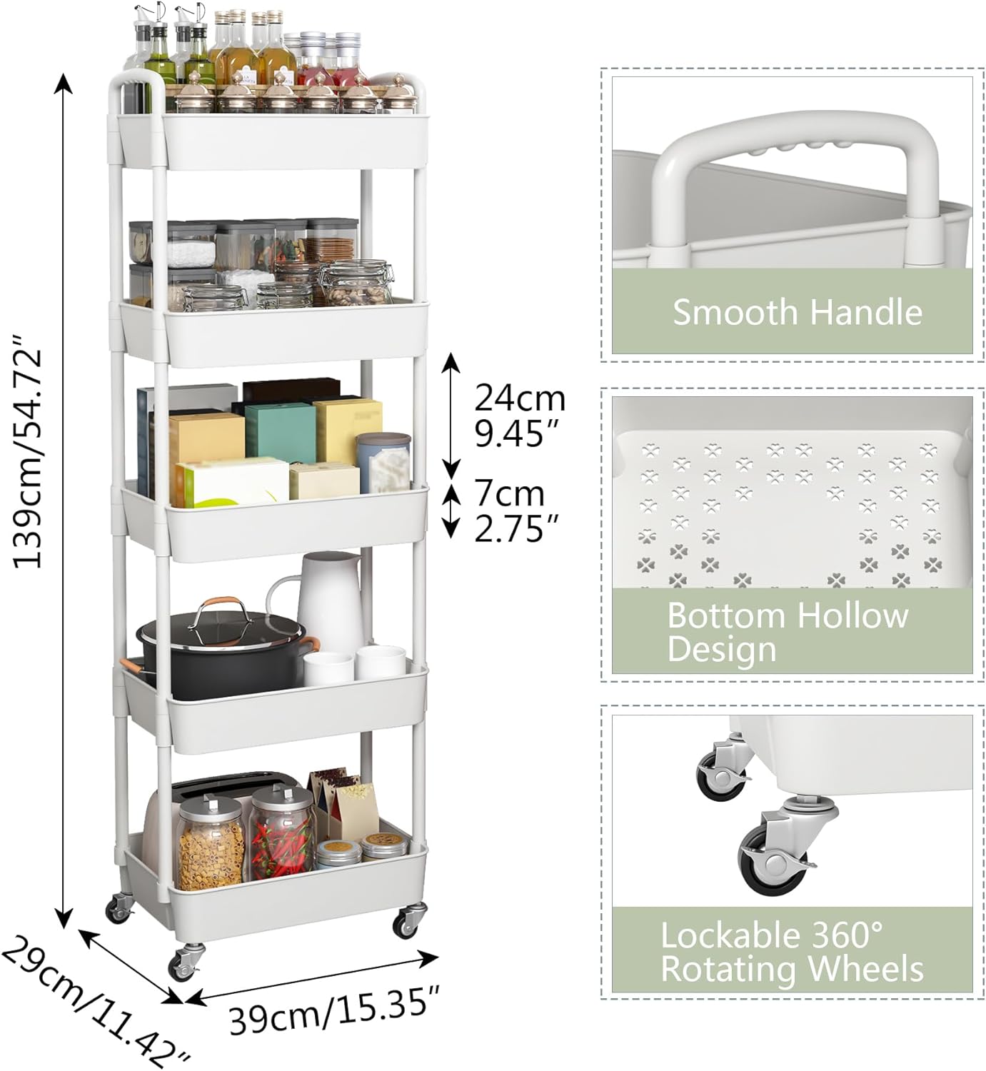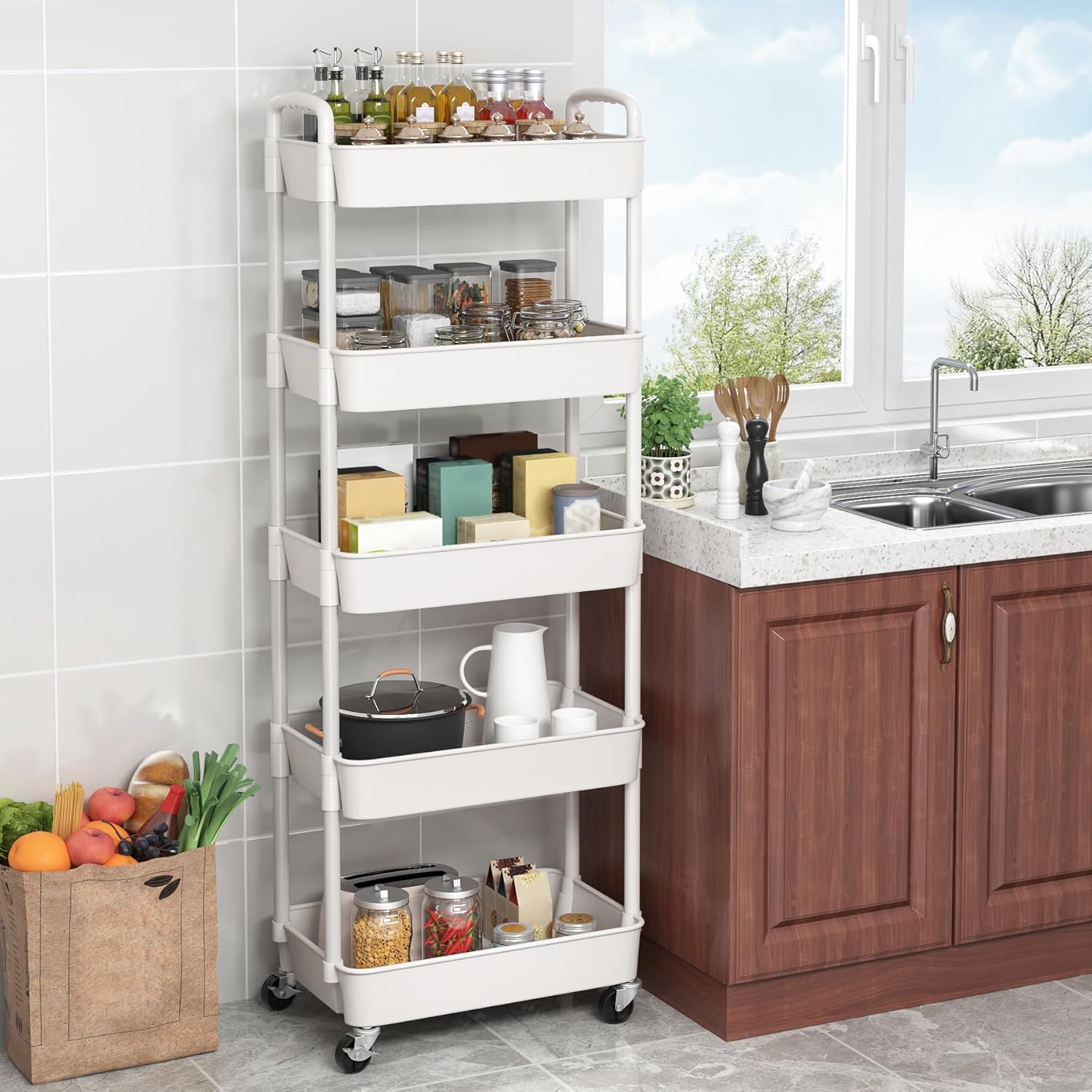 Sywhitta 5-Tier Plastic Rolling Utility Cart with Handle, Multi-Functional Storage Trolley for Office, Living Room, Kitchen, Movable Storage Organizer with Wheels, White