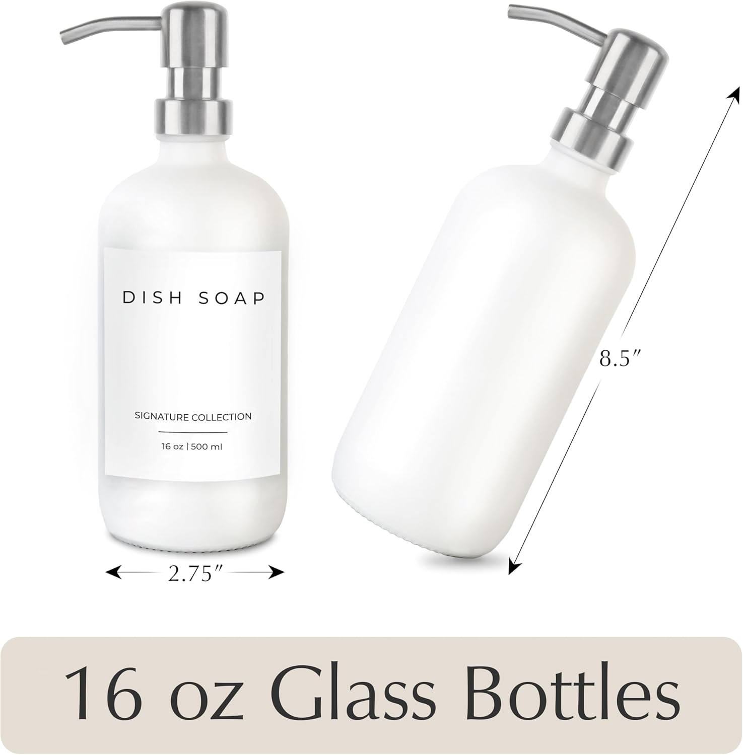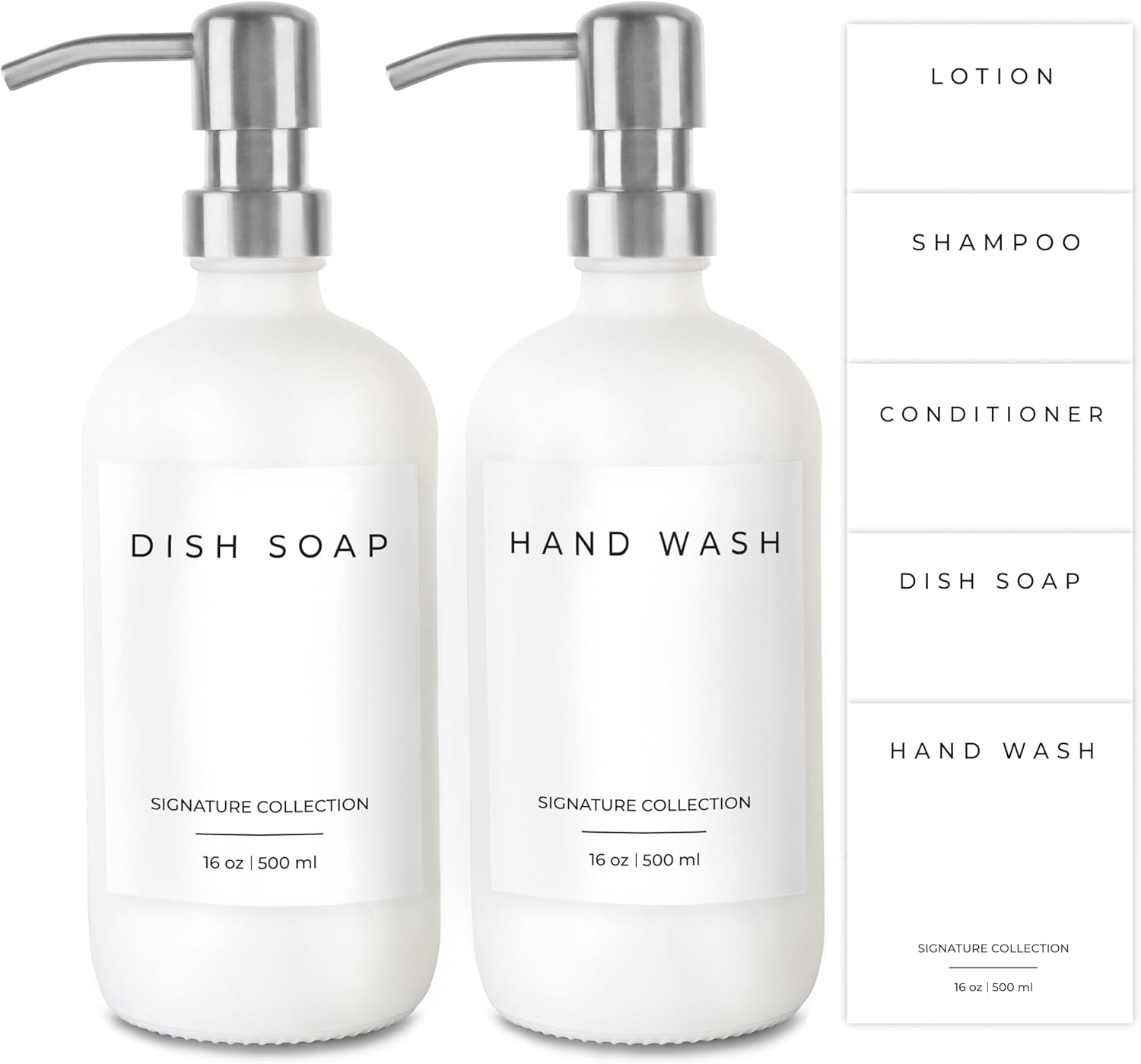 • ✅ 2-in-1 COMBO: Upgrade your home with our glass soap dispenser set. The dish soap dispensers are crafted from the highest quality glass and can be used as soap dispensers for kitchen sinks, soap dispensers for bathrooms, or as hand soap dispenser of your favorite liquid. The kitchen soap dispensers come with 2 dish soap dispensers for kitchen bottles (16 ounces), 2 stainless steel pumps, and 5 waterproof labels. Our selection includes colors including amber, clear, white, and black.