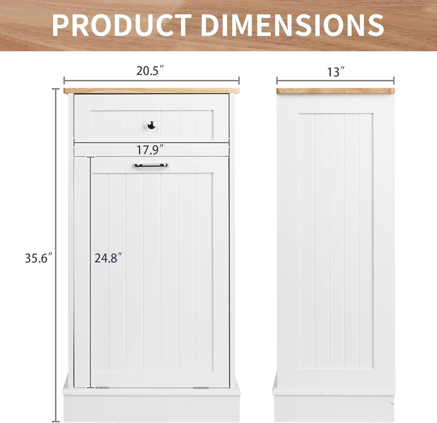• 🏡【Durable and Stable】 35.6 "H x 20.5 "L x 13 "W cabinet support is stable enough to hold up to a 35 lb (ca. 16 kg). Our Trash can, a perfect match for a 10-gallon trash can.(trash can not included) Rubberwood top surface provides extra cutting space, and can easily withstand even a microwave and coffee maker