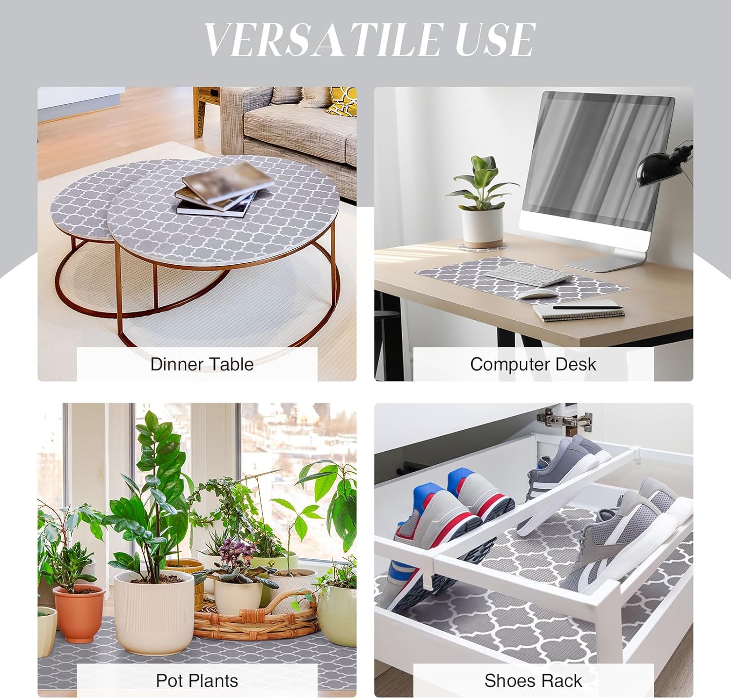 • 👍 PERFECT STORAGE SOLUTION- These shelf liner come in 17.5" x 30 ft. Made of eco-friendly EVA material and feature a non-slip design, the shelf liners for kitchen cabinets help prevent spillage by keeping your items locked into place and free from unwanted dirt and debris. The plastic drawer liners for dresser is ideal for use in a top drawer, bedroom dresser, bathroom cabinets, kitchen cabinets and desk drawers for organizing and protecting small items from damage or scratches.