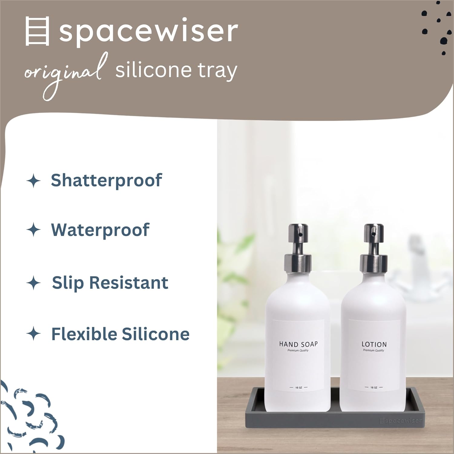 • Use It Anywhere - Choose the endlessly useful and aesthetically pleasing tray that works anywhere. The Spacewiser Original Silicone Tray is perfect as a bathroom tray, vanity tray, soap dispenser tray, kitchen soap tray or sink caddy. The trays are made of premium food grade silicone, without the addition of potentially unsafe thickening agents or chemicals. They’re shatterproof, waterproof, slip-resistant, heat resistant to 425F, and dishwasher safe- a perfect soap dish or sponge holder.