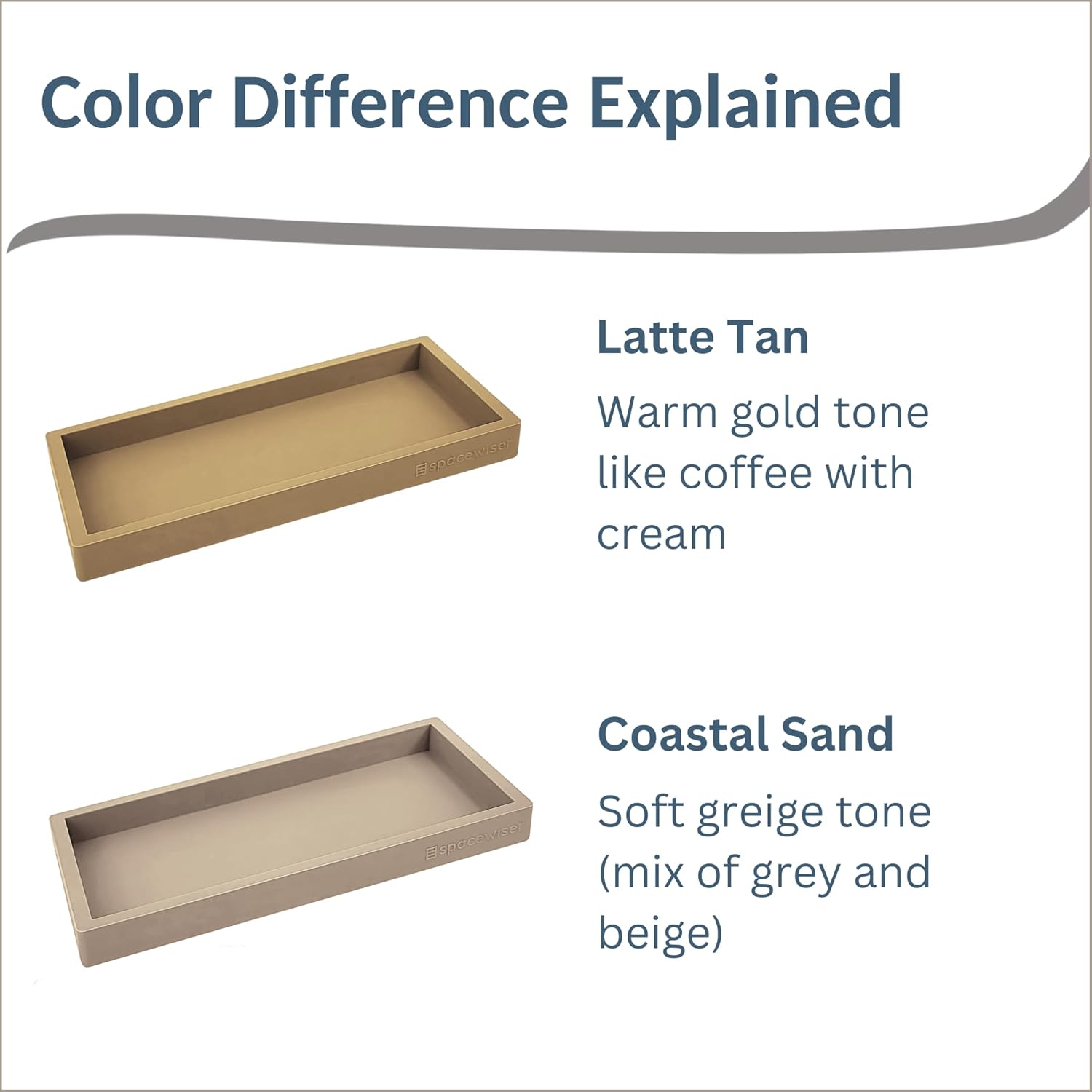 • The Details – Small Latte Tan Tray - 7.7” x 4”. Made of flexible but sturdy food grade silicone. This latte tan tray has a warm gold tone and is the perfect gold soap dispenser kitchen tray, gold bathroom tray, or gold vanity tray. It’s a perfect gold tray for bathroom counter areas or gold soap holder.