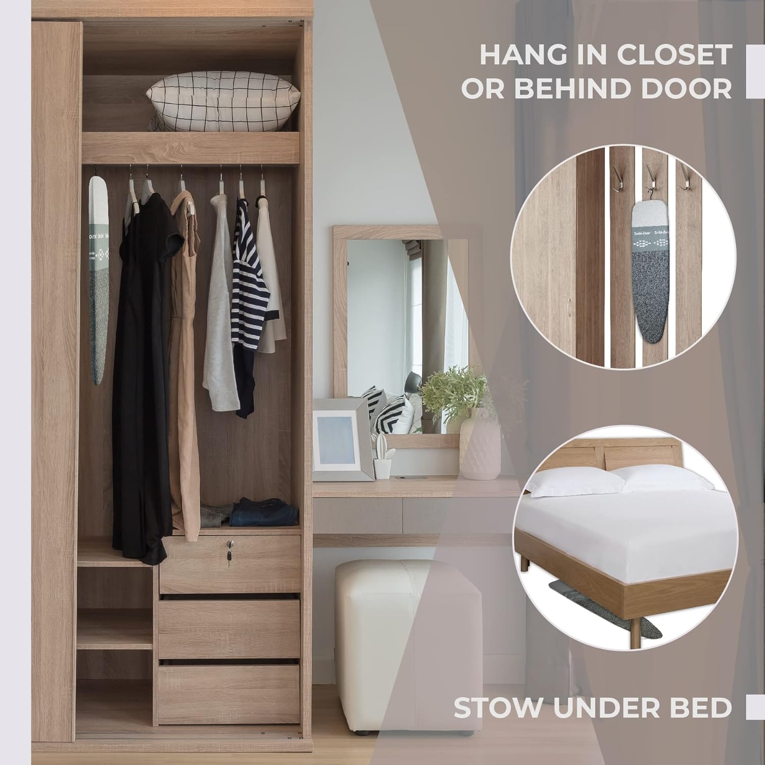 • STORAGE HANGER - LIGHTWEIGHT, Special designed hanger to hang the ironing board in closet, lightweight easy to carry and take wherever needed, it folds almost flat to save storage space, it’s the perfect size for storage in your bedroom closet, a laundry room, or a dorm