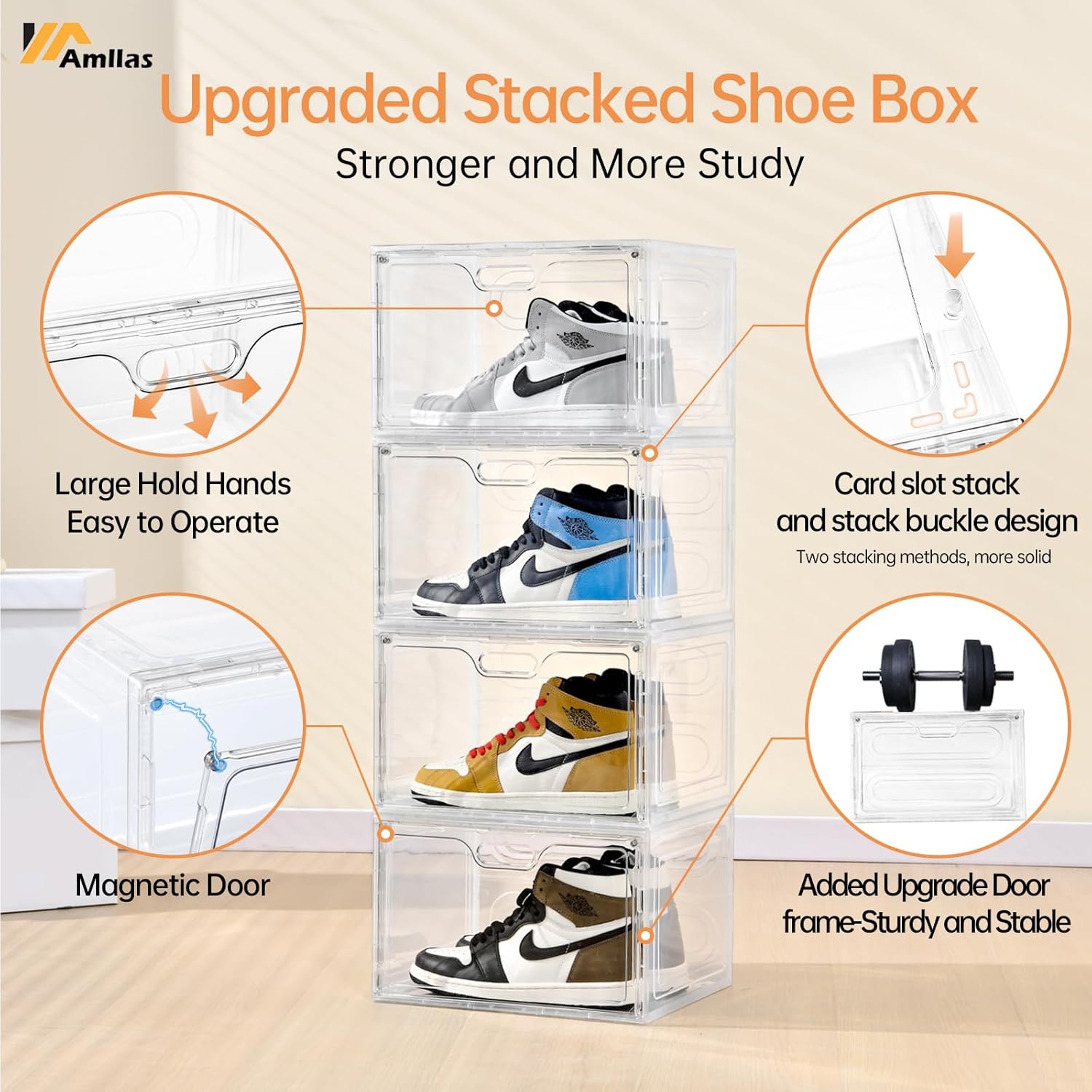 • [Extra Large Capacity]13.4’’L*10.6”W*8.3”H-The upgraded large shoe display boxes are suitable for US shoe size up to 13,which designed with a larger storage capacity.So don’t worry about the shoe boxes space. The shoe display case can keep your messy shoes well organized.which is suitable for many types of shoes such as boots, leisure, sneakers and high heels.