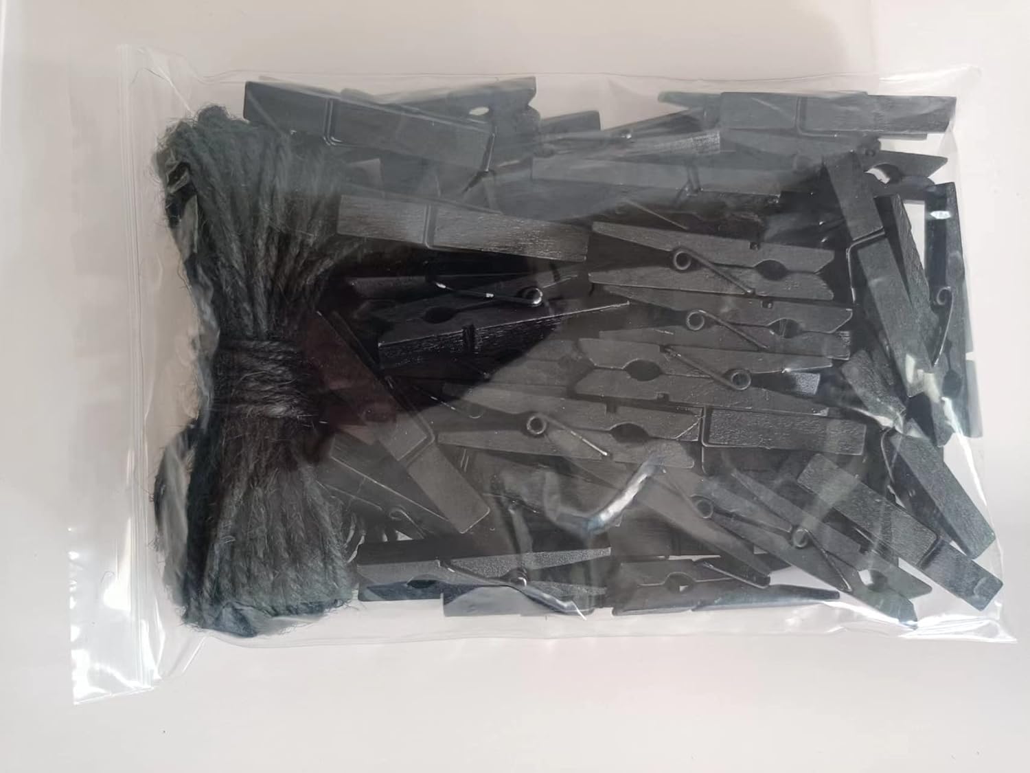 • Clothespins Set: 50 pcs black wooden clothes pins with 10 meters(33feet) black twine string to hang pictures or gift Decor