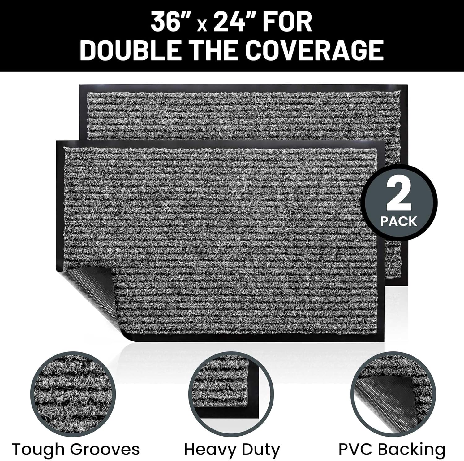 • Includes 2 Larger Indoor Outdoor Floor Mats: Enjoy two amazing heavy duty high quality ribbed polyester door mats (Larger 36" x 24") that will be perfect welcome for the everyday home. Amazing value 2-Pack.
