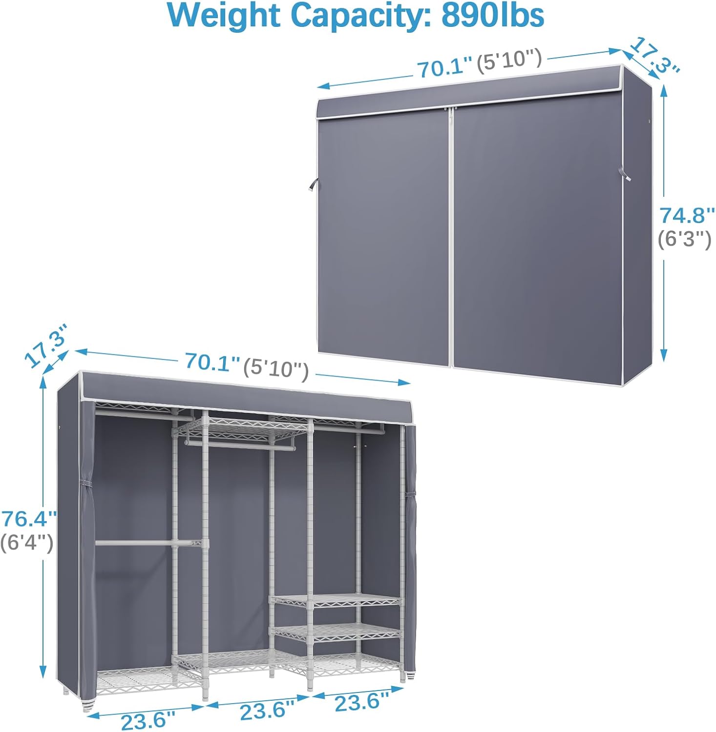 • Dimensions & Load Capacity: 70.1" L x 17.3" W x 76.4" H (includes cover). Load capacity up to 890 lbs. Single hanging rod can support up to 60 lbs, Wire shelf can support up to 88 lbs for each.