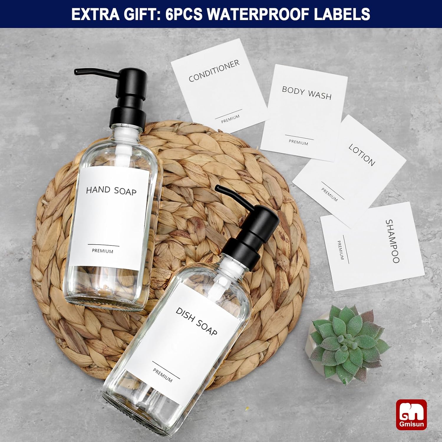 GMISUN Glass Soap Dispenser with Pump, 2 Pack Clear Bathroom Hand Soap Dispenser with Stainless Steel Pump, 16 Oz Refillable Kitchen Hand and Dish Soap Dispensers Set, Modern Liquid Pump Bottles