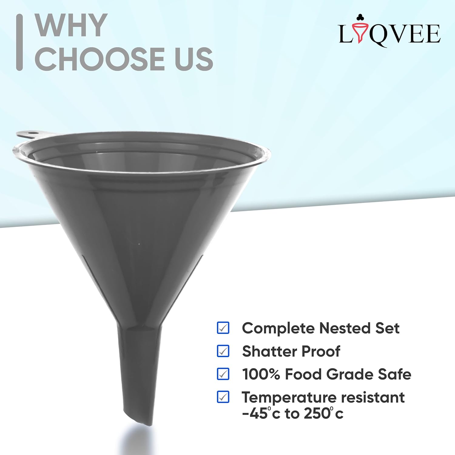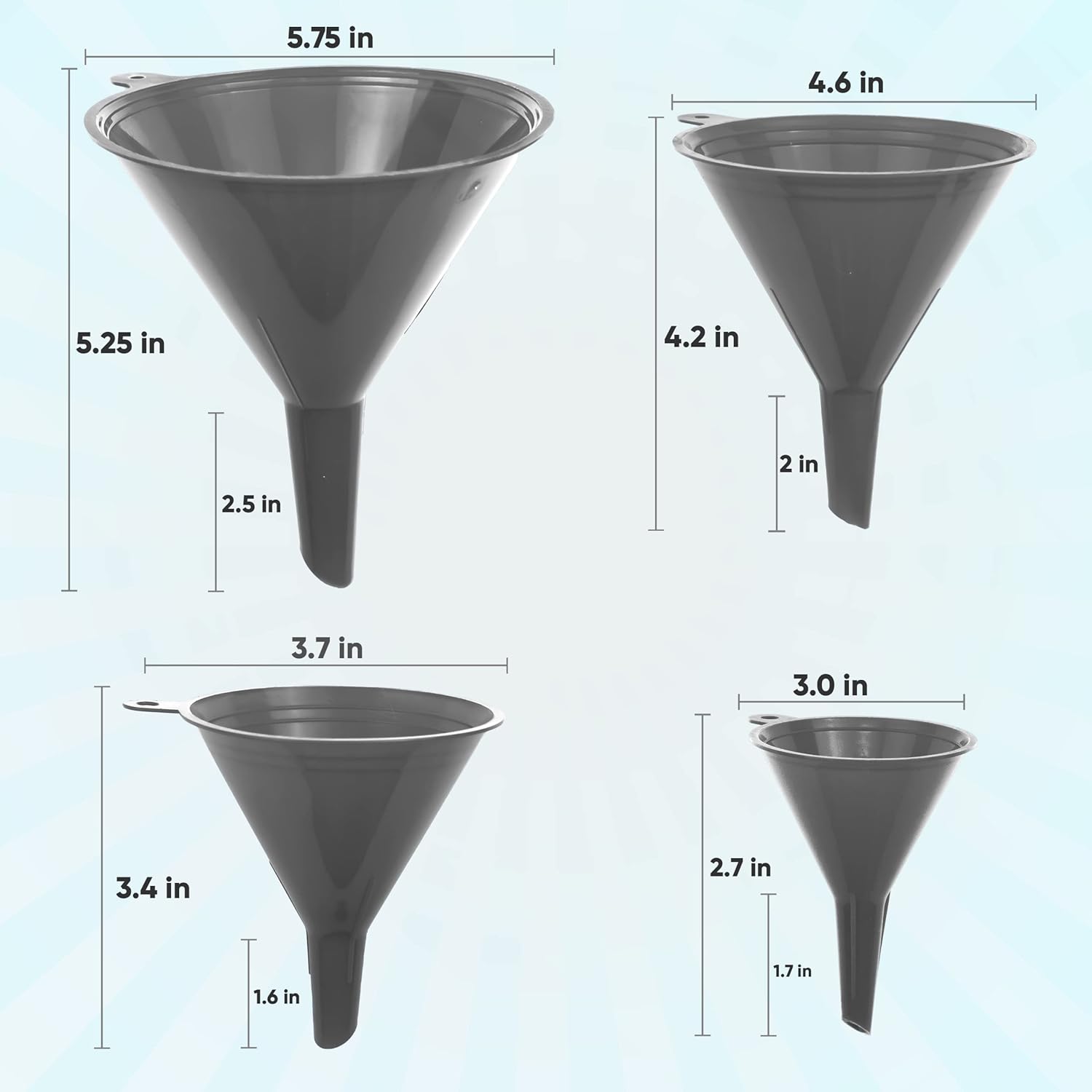 • 4 Funnels in One: Our plastic funnel set comes in a pack of different sizes to fit various applications. The extra-large funnel measures 120mm, the large one is 100mm, the medium 75mm, and the small funnel is 50mm. Each size has its specific function.