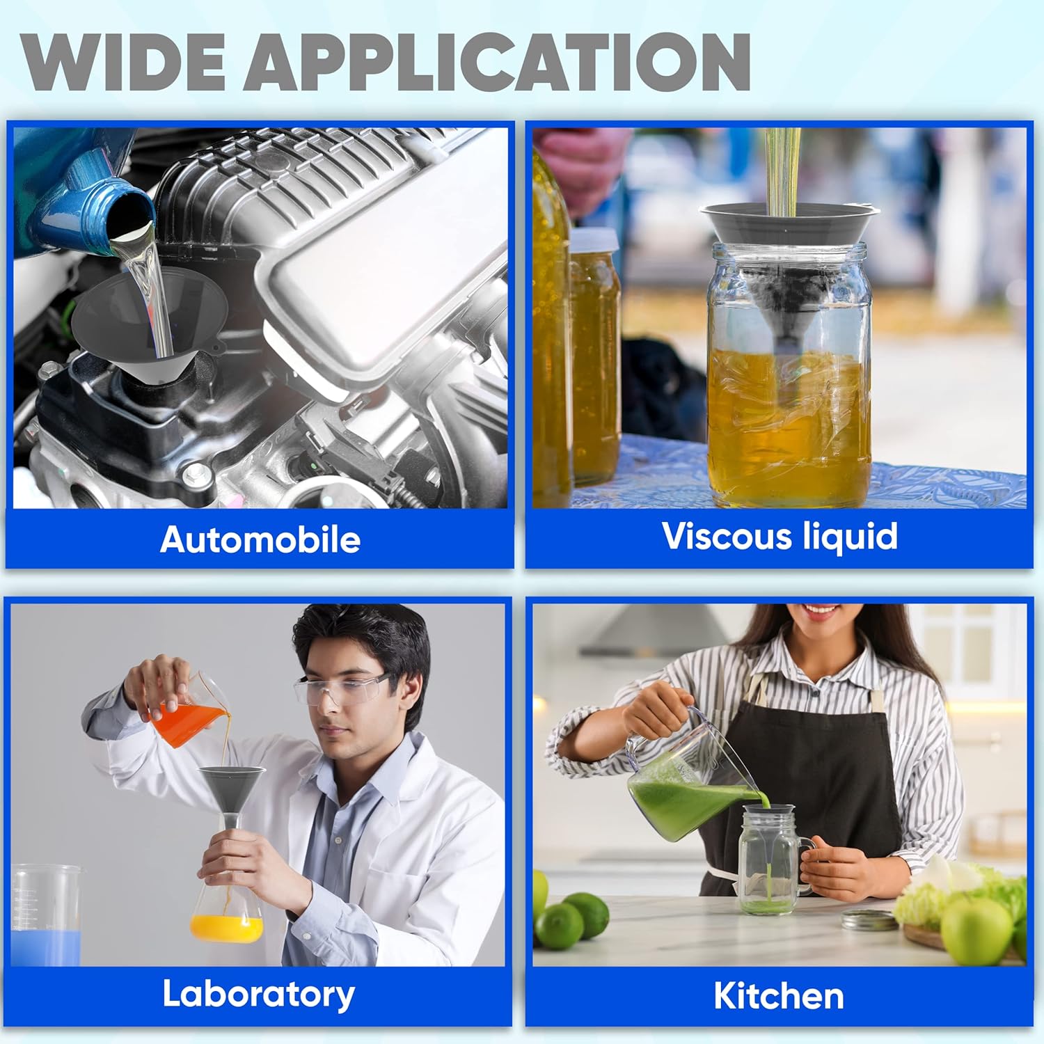 • Make Your Life Easier: Our funnel set is the perfect solution not only for transferring oil, spices, or car fuel but also for craft projects. Use the mini funnels for filling small bottles to sprinkle decorations on your art projects or for laboratory tasks at school.
