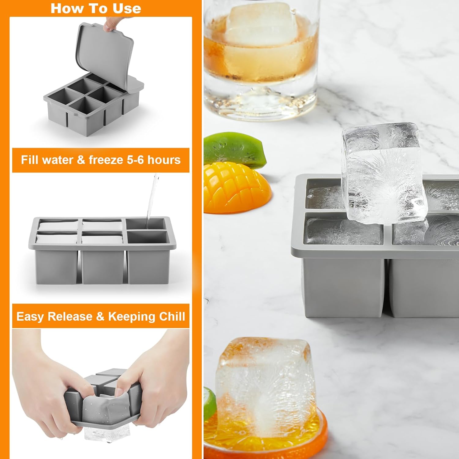 • 3 Pack Large Ice Cube Tray With Lid: Comes with set of 3, 6 giant ice cubes per ice mold, 2 inch large per ice cube and shapes square; Perfect to chill cocktails, whiskey, tequila, vodka or other drinks with less dilution. You can also use these ice molds to freeze food in perfect portions, such as soup broth or sauce servings, recipes, baby food storage, meal prep, and portion controlled meals