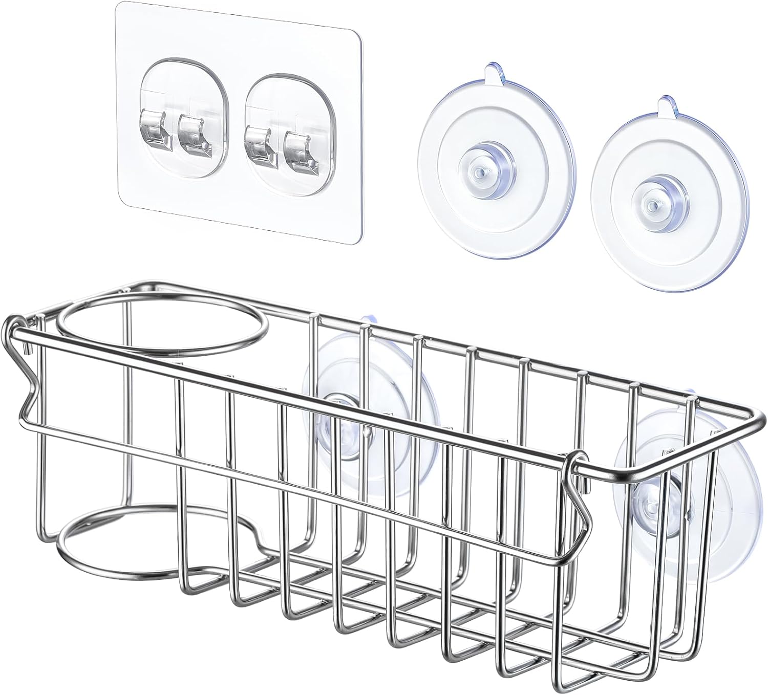 3-In-1 Sponge Holder for Kitchen Sink with Suction Cups & Adhesive Hook, In-sink Sponge Holder, Wall Hanging Sink Caddy Organizer Rack - Sponge, Dish Cloth, Brush, Scrubber - 304 Stainless Steel